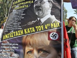 Das mit den Nazivergleichen in Griechenland hat ja eine gewisse Zielrichtung. Es wird ja ernsthaft von Historikern in Griechenland nachgeforscht, ob man nocht etwaige Reparationszahlung an Deutschland stellen kann. 67 Jahre nach Kriegsende. Betrieben wird dies vom griechischen Finanzministerium.