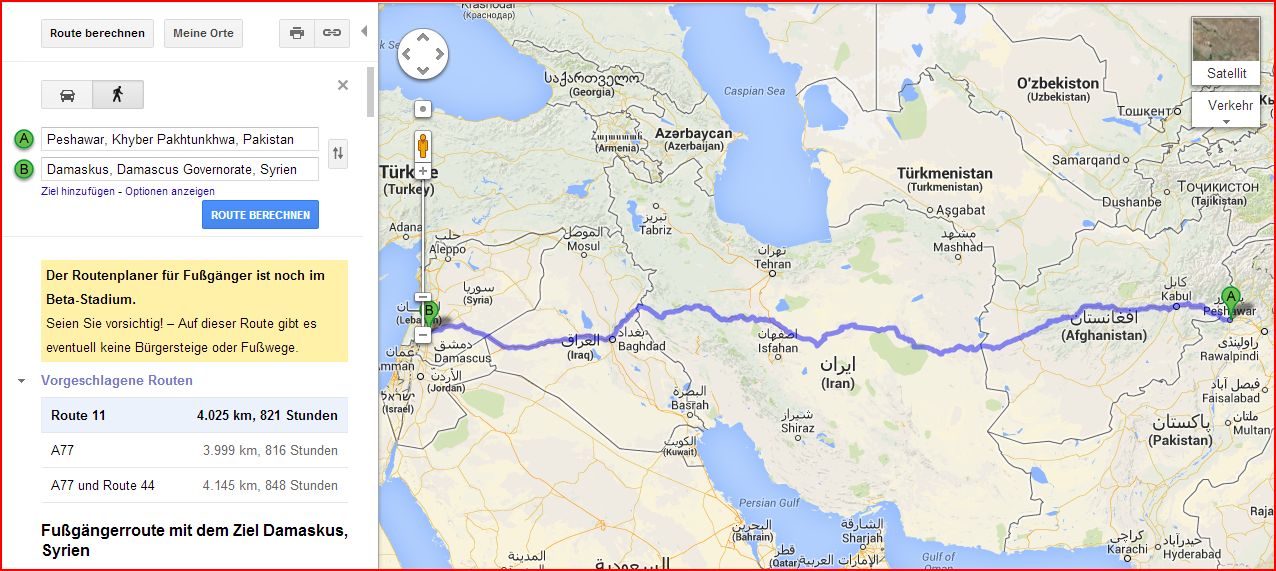 Beim Planen meines nächsten Abenteuers habe ich mal eben Google Maps nach der Streckenführung für einen Fußmarsch von Pakistan nach Syrien gefragt.