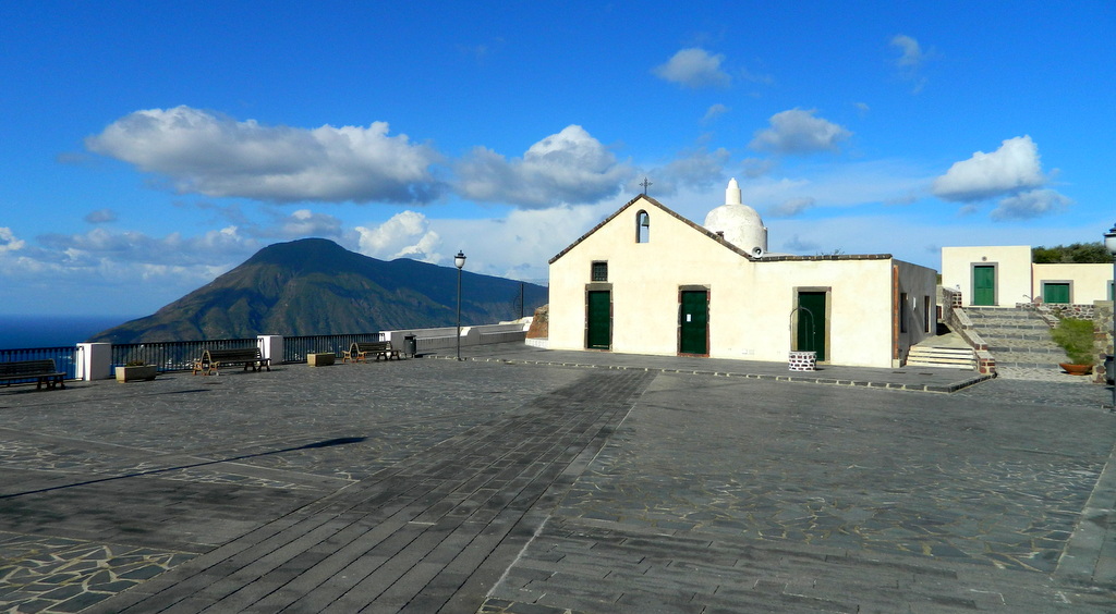 Fünf der anderen sechs Inseln kann ich von hier aus sehen. Die Vulkanberge von Salina, Panarea, Filicudi, Alicudi und Stromboli stechen aus der königsblauen See. „Komm uns doch auch besuchen, wir sind mindestens so schön wie Lipari!“ scheinen sie mir zuzurufen. Hinter der Kirche geht ein leichter Abhang zu einer windgeschützten Stelle, gelbe Blumen blühen, das Gras ist grün und weich, ein wunderbarer Ort für ein Picknick. Ich habe Lust, mich ein paar Stunden ins Gras zu legen und die Sonne zu genießen, aber ein ehrgeiziger Wanderplan drängt mich weiter.