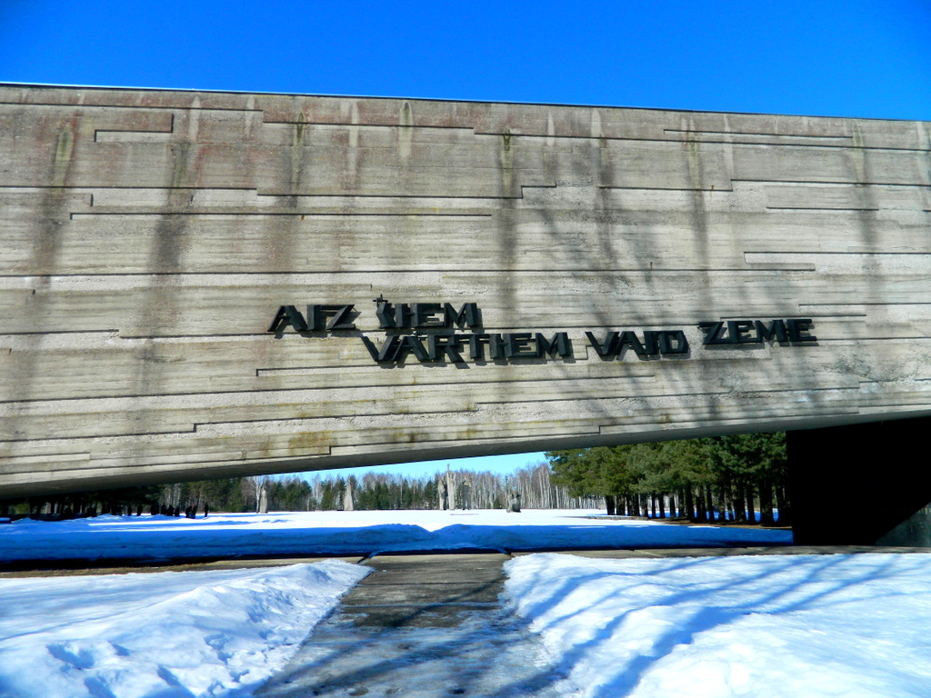 Die große, freie, jetzt schneebedeckte Fläche wird dominiert von sieben riesigen Betonskulpturen. Errichtet wurden sie 1967. Sowohl Stil als auch Aussage sind deutlich sowjetisch. Die monumentalen Figuren sollen nicht nur an das Leid und die Unterdrückung, sondern auch an den erfolgreichen Kampf gegen den Faschismus erinnern. Sie sind wuchtig, wie fast alles was die Sowjetunion je unternommen hat.