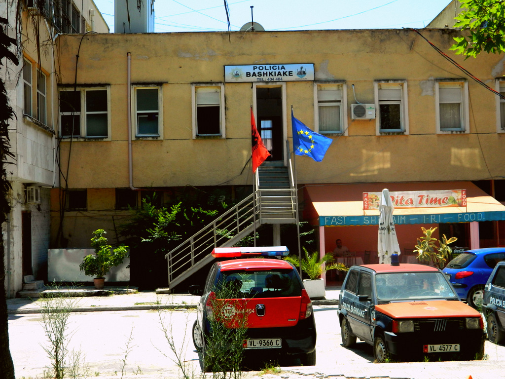 (Das Foto zeigt die Polizeiwache in Vlora im Juli 2014. – Click here to read this article in English.)