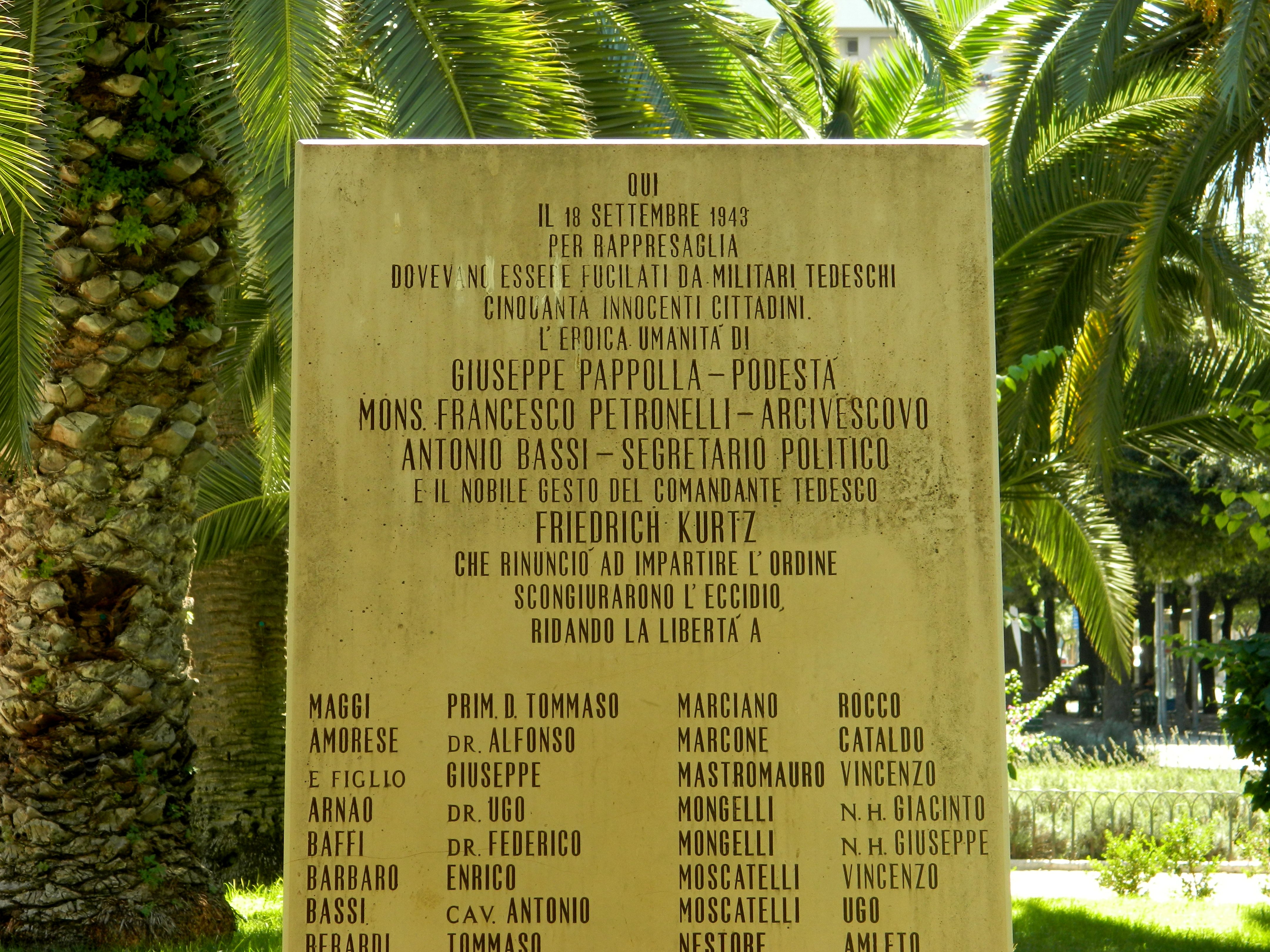 Tatsächlich: Einige Tage vor dem 18. September 1943 waren in der Nähe von Trani fünf deutsche Soldaten in einem Hinterhalt erschossen worden. Die Deutschen vermuteten italienische Partisanen dahinter, und gemäß den damaligen Gepflogenheiten der Wehrmacht erhielt Oberleutnant Kurtz den Befehl, zur Bestrafung 50 männliche Bewohner der Kleinstadt zu erschießen. Die Geiseln waren bereits zusammengetrommelt, das Erschießungskommando stand bereit, als der Bürgermeister, der Erzbischof und die Frauen der Geiseln das Gespräch mit Kurtz suchten.