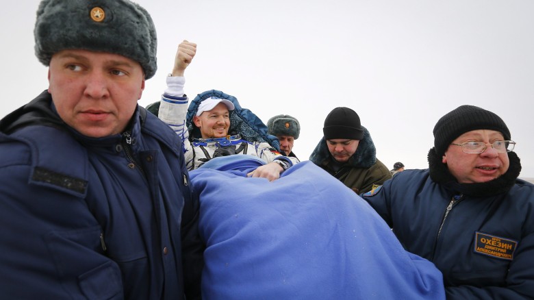 Das ist meines Wissens üblich. Durch den Aufenthalt im All sind nicht nur Muskeln und Knochen geschwächt, auch das Herz schlägt in der Schwerelosigkeit anders. Zurück auf der Erde kann das dann den stärksten Astronauten umhauen. Mir wäre das auch peinlich, aber ich denke, die lassen einen – insbesondere nach so einem langen Augenthalt – gar nicht laufen. Oder muss ich meinen Ironie-Detektor neu justieren?