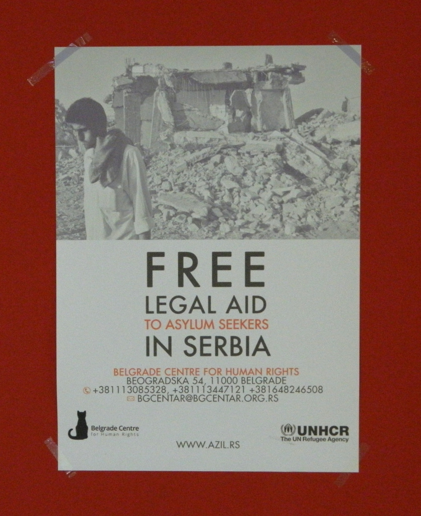 Am Flughafen in Belgrad sah ich dieses Poster, das kostenlose Rechtsberatung für Asylsuchende anbot. Das ist Willkommenskultur.