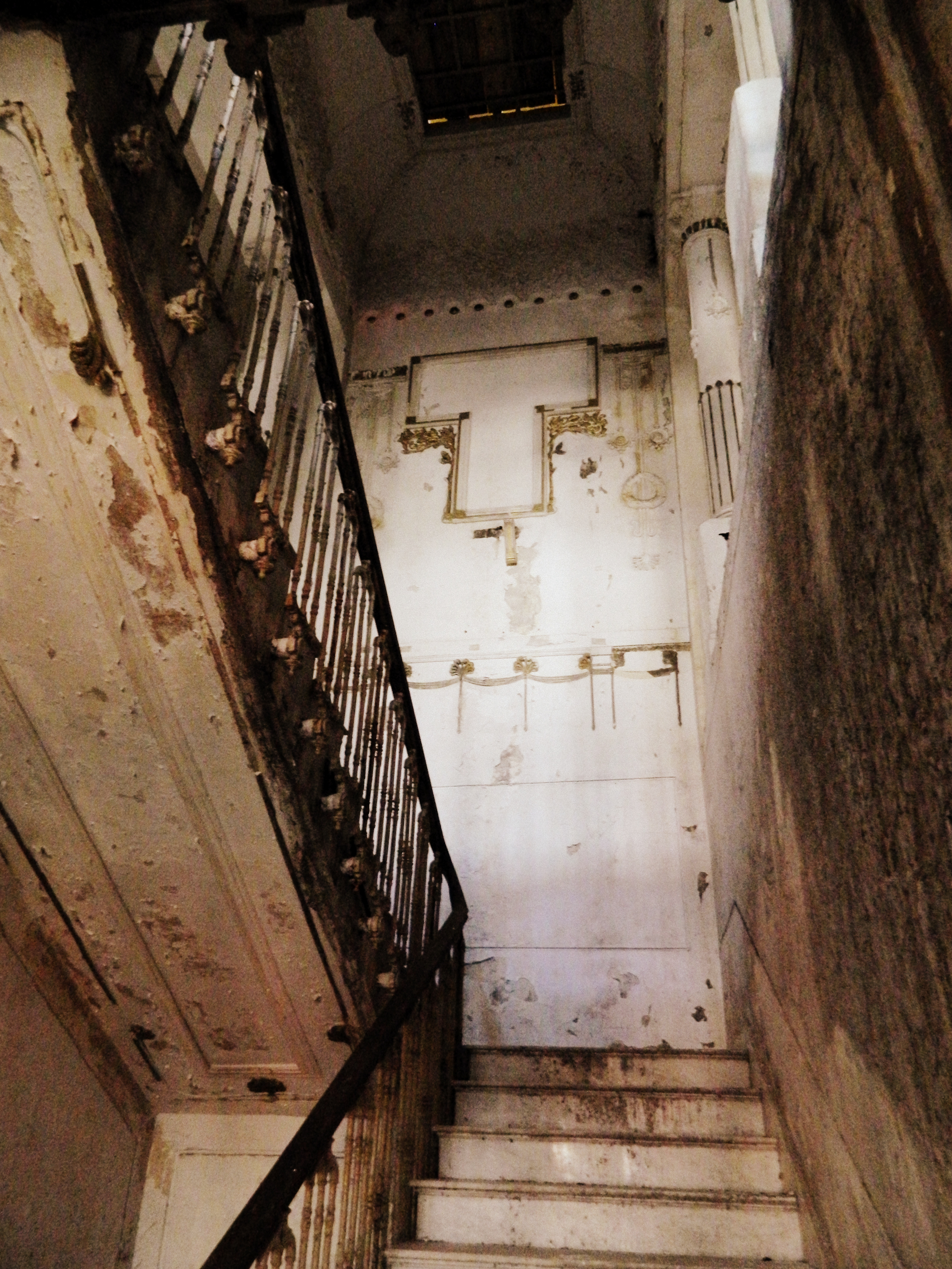 Das Treppenhaus mit den Säulen, dem Stuck und dem verzierten Geländer zeigt Spuren einstiger Grandesse. Leise, vorsichtig und langsam wage ich mich nach oben. Mir ist bewusst, dass ich gefangen wäre, wenn ich die Tür zufallen hören würde. Aber meine Neugier obsiegt.