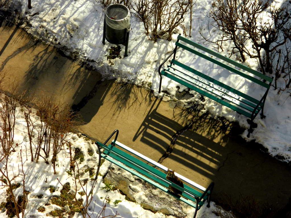 Der Schnee schmilzt. Es ist sonnig und schon warm genug, zumindest den mit- und nachmittäglichen Teils des Tages draußen zu sitzen und zu lesen. Das Gleiche, minus das mit der Lektüre, dachte sich diese Katze und machte es sich unterhalb meines Balkons bequem.