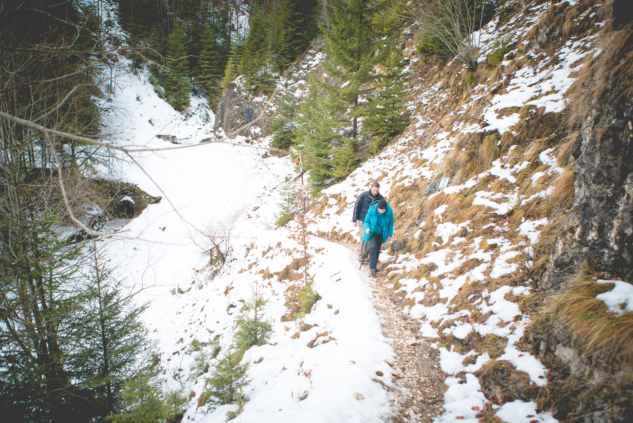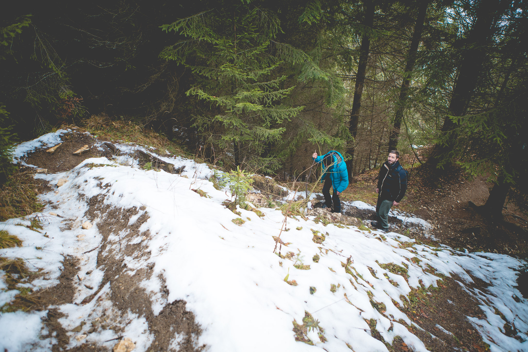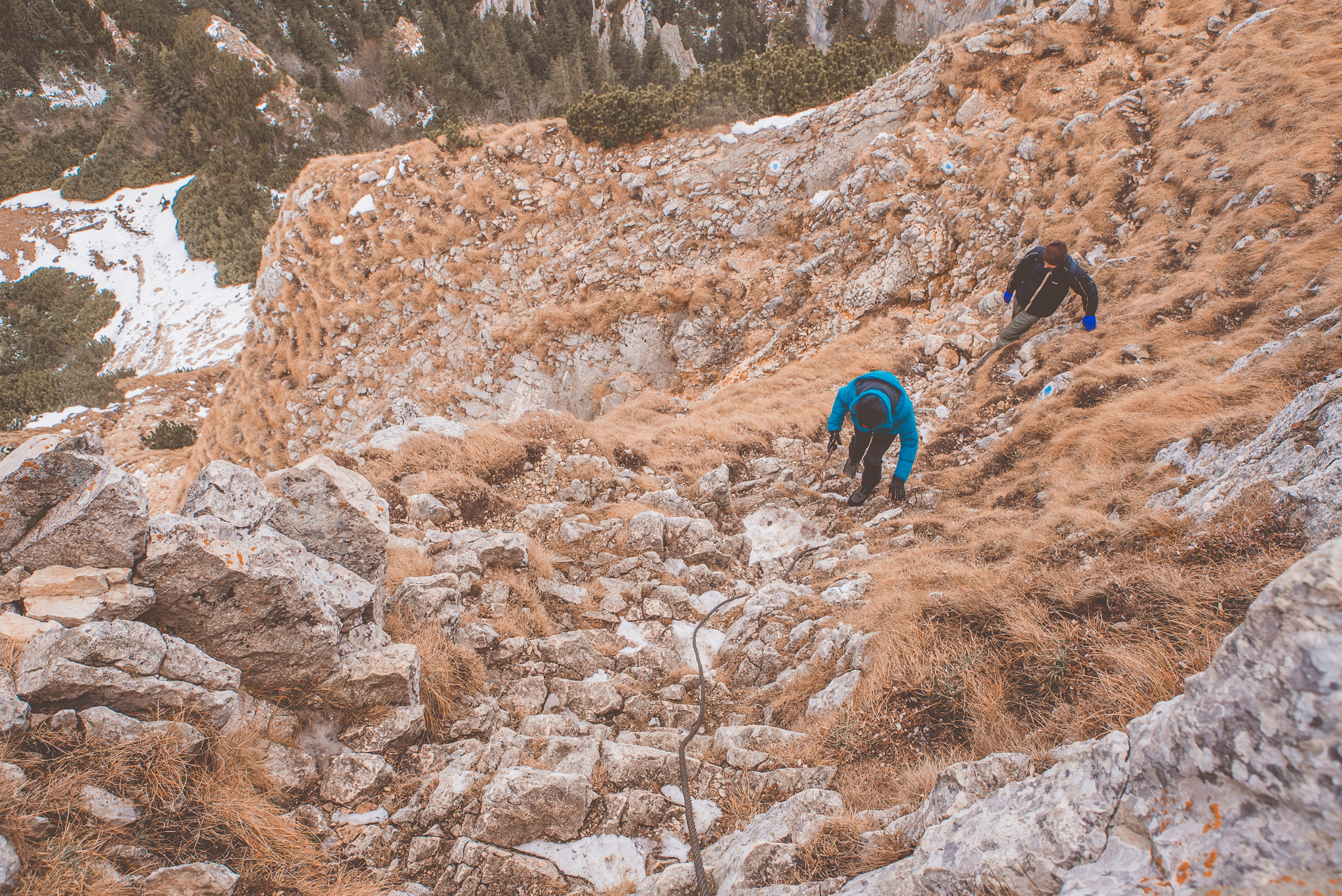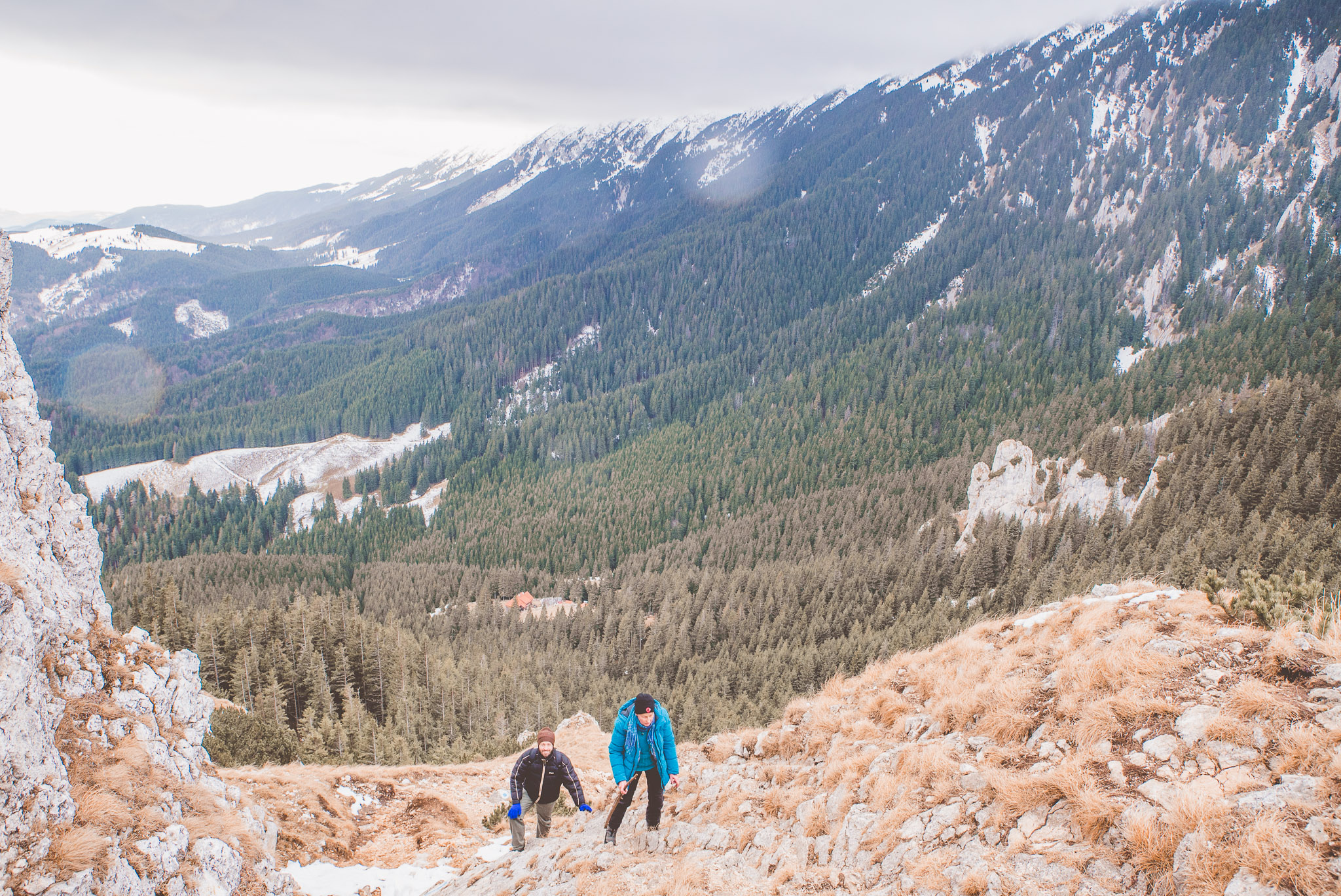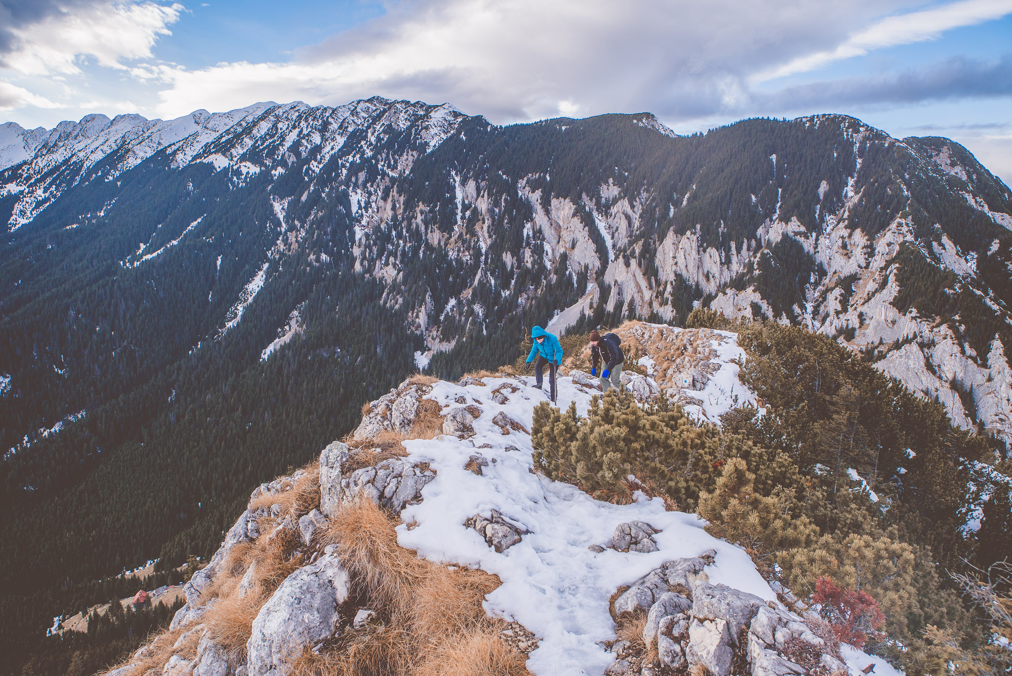 Und dann wurde es richtig hart. Ich hatte mir vorgenommen, den Piatra Mică zu besteigen. Mit 1.816 Metern zwar nicht allzu hoch, aber die von uns gewählte Route erforderte doch einiges an Kletterei. Im Dezember. Im Schnee. Ohne besondere Ausrüstung. Ohne dass irgendjemand von uns den Weg schon einmal gegangen war.