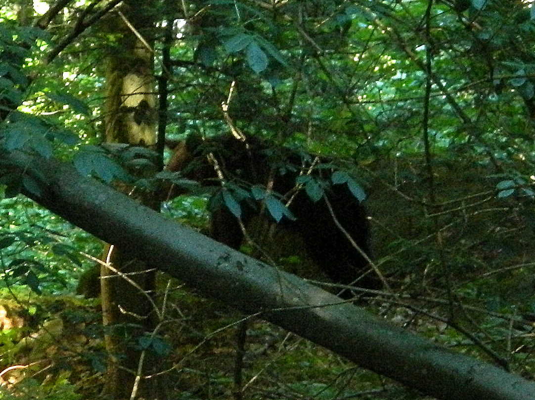 Ich ging leise und vorsichtig, passte auf, keine Äste zu zertreten, und trug sicherheitshalber sogar meine Brille. Nur ein paar Minuten außerhalb der Ortschaft raschelte es links von mir im Wald. Es daurte ein wenig, bis ich es erkannte. Tatsächlich: ein Bär!