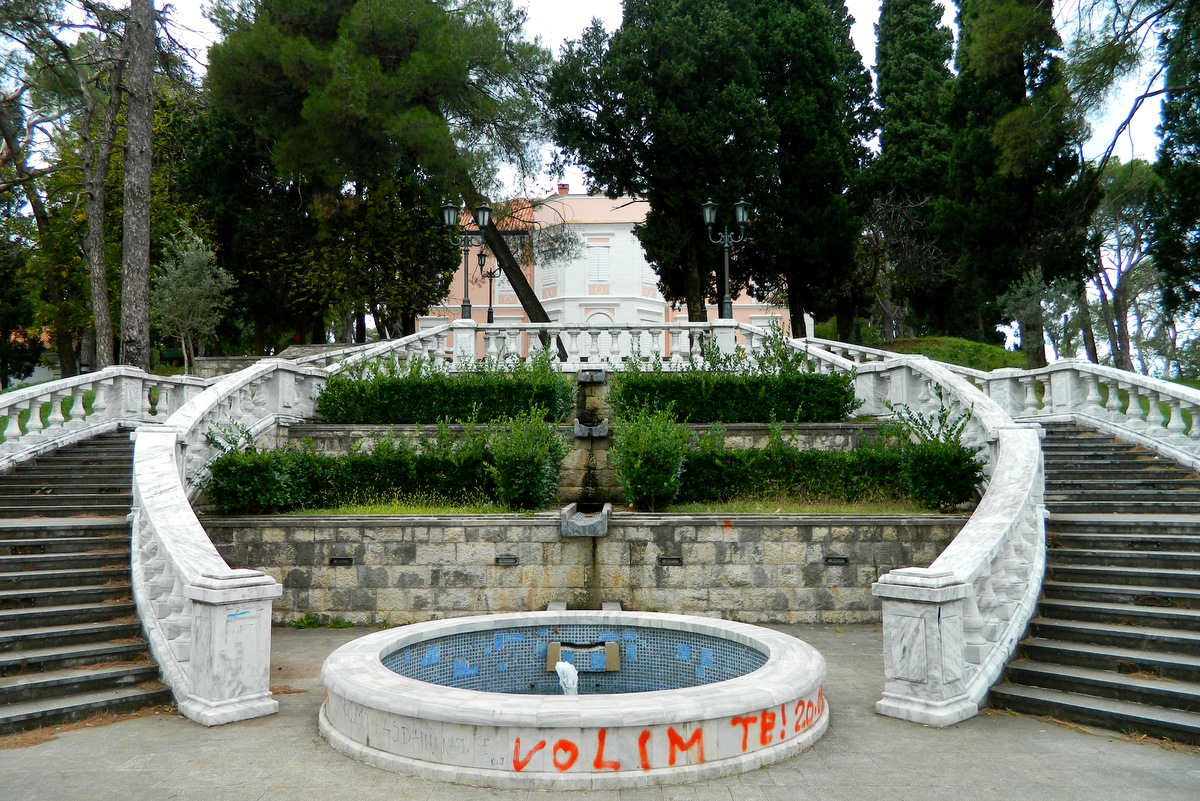Über die Brücke ans andere Ufer der Morača, dort durch einen großzügigen Park zum Winterpalast auf dem Kruševac-Hügel. Irgendetwas mit Königsfamilie, österreichische Besatzung im Ersten Weltkrieg, Krankenhaus, Museum für Tito-Bilder habe ich mir gemerkt, aber vielleicht bringe ich das durcheinander.