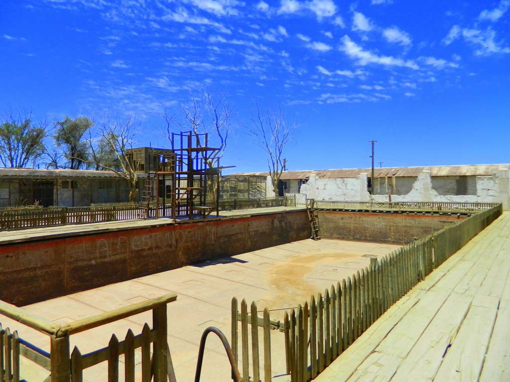 Dabei war Chile eigentlich das pünktlichste Land in Südamerika. Aber vielleicht gingen die Uhren in Humberstone, dieser Stadt tief in der Wüste, anders? Apropros Uhr, den Turm mit derselben konnte ich von der Tribüne aus erspähen. 15:58 Uhr.
