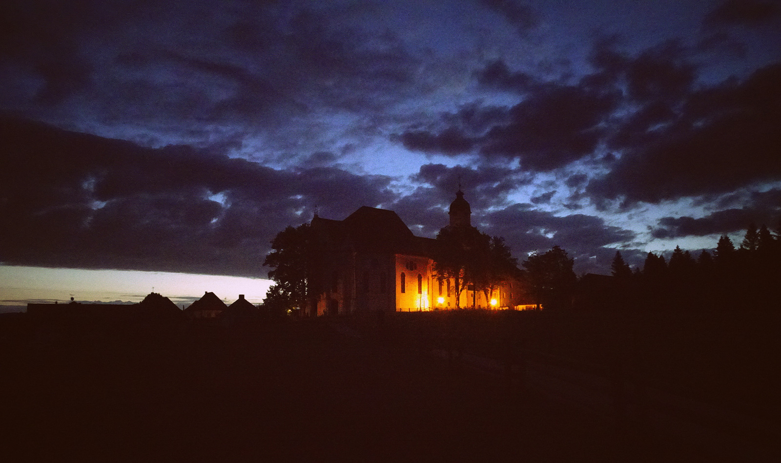 An Schlaf ist nicht mehr zu denken. Also packe ich meine Sachen und mache mich auf den Weg, anstatt sinnlos herumzusitzen und zu frieren. Der Vollmond leuchtet, soweit ihn die Wolken freigeben, und der Weg zur Wieskirche ist nicht weit. Die Bewegung tut den Gelenken gut.