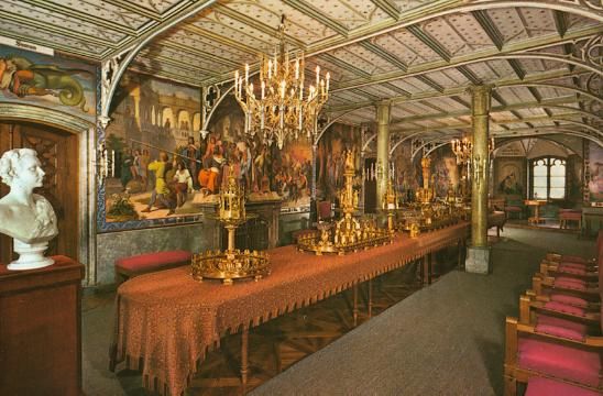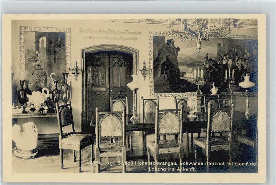 Der Speisesaal ist der Schwanenrittersaal. Der Komponist Richard Wagner, dessen größter Fan und Förderer Ludwig II. war, weilte öfter auf Schloss Hohenschwangau. Wagner bekam ein Piano und das Gästezimmer mit dem schönsten Ausblick über den Alpsee. Leider sah der Komponist nicht aus dem Fenster, sondern auf die kitschigen Gemälde. Deswegen haben wir vom ihm jetzt diesen Heldenscheiß anstatt die Landschaft vertonende Musik wie von Smetana oder Čiurlionis.