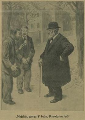 Das mit dem Spazierengehen in München lag den bayerischen Königen, außer Ludwig II., anscheinend. Eine Episode zeigt, wie banal historische Ereignisse manchmal daher kommen: Die Nachricht von seinem Sturz erfuhr König Ludwig III. am 7. November 1918 während eines Nachmittagsspaziergangs im Park. Zwei Passanten, die besser informiert waren als der Herrscher, waren nett genug, ihn zu warnen: „Majestät, gehen’s besser heim. Es ist gerade Revolution.“ Der König spazierte zurück zur Residenz, wo Dienerschaft und Wachpersonal schon geflohen waren. Er packte seine Frau, seine Kinder und ein paar Sachen ins Auto und fuhr ins Exil nach Österreich. In der Eile hatte er vergessen, Unterwäsche einzupacken, die ihm der Revolutionsführer und neue Ministerpräsident Kurt Eisner ein paar Tage später nachschickte.