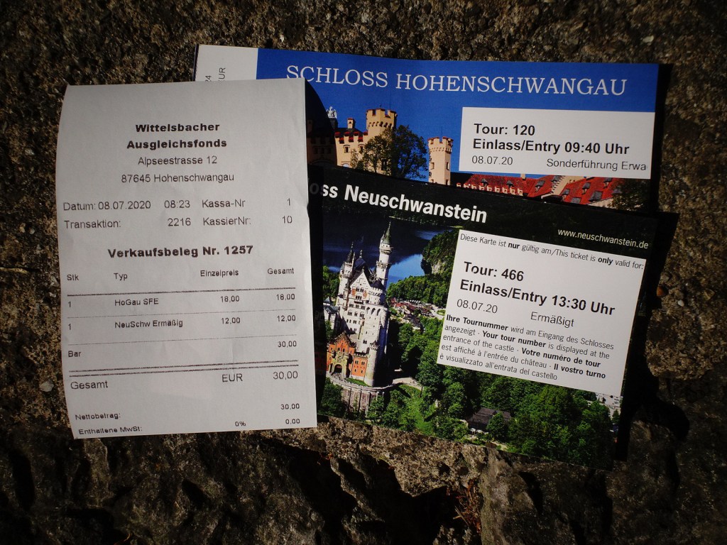 30 € kosten die zwei Schlösser, was ich mir ohne die großzügigen Spenden der Leserinnen und Leser gar nicht hätte leisten können. Wenn Euch die kommende Führung durch die prächtigen Königsschlösser gefallen wird, bedankt Euch also bei den edlen Spendern.