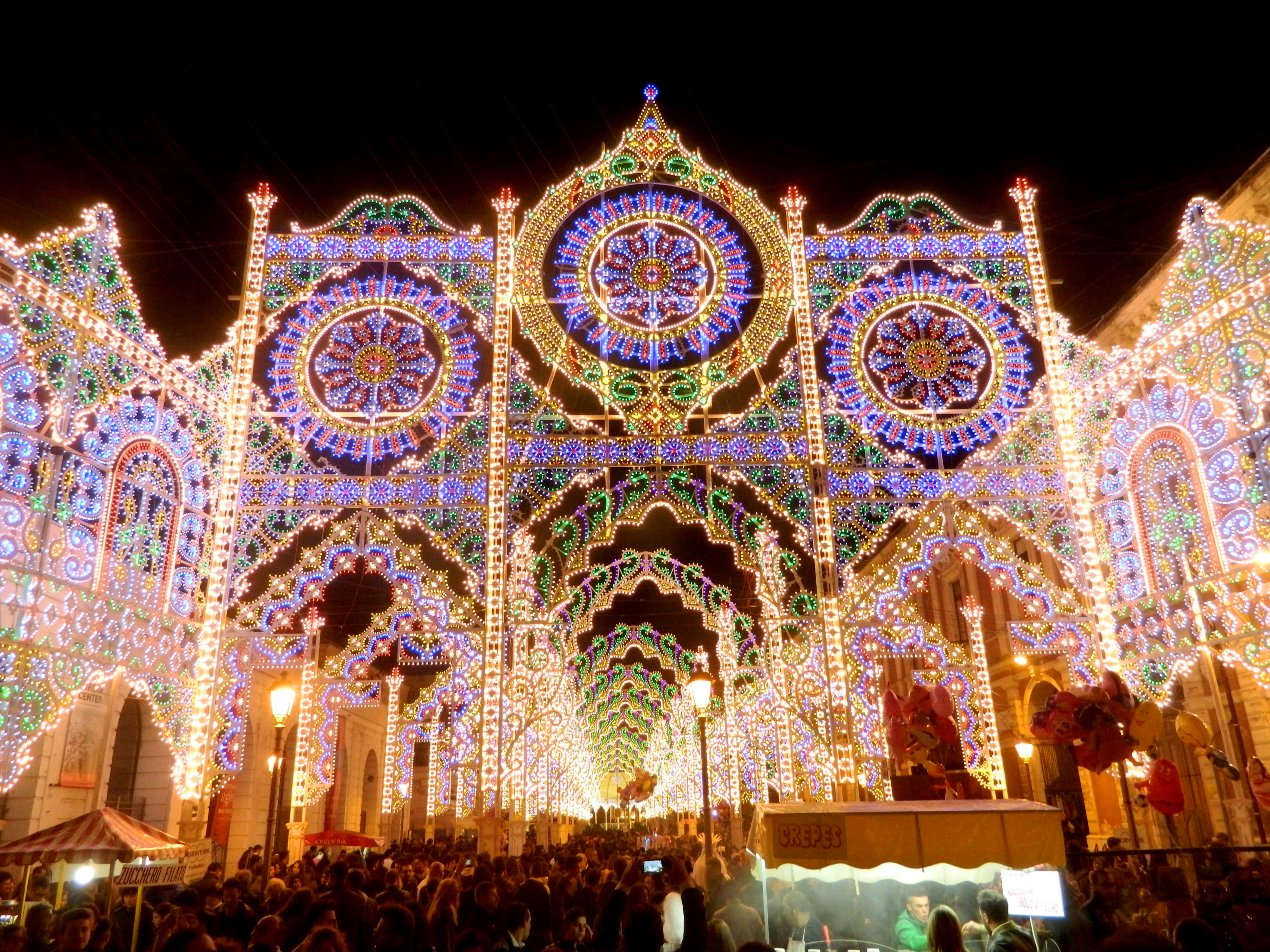 Es ist 23 Uhr, ich muss mich endlich stärken. Die Küstenstraße ist auf Kilometer hinaus beidseitig gesäumt von Ständen, die Gebratenes, Frittiertes, Süßes, Gegrilltes, Eisgekühltes, Salziges, Klebriges, Buntes, Schmackhaftes, Kalorienreiches aber nicht allzu viel Gesundes verkaufen. Die verschiedenen Gerüche vertragen sich gut miteinander, die aus den Lautsprechern der Buden dröhnenden Bässe und Gesangseinlagen weniger. Die Einwohner von Bari werden dank dieses Festes insgesamt geschätzte 1 Million Kilos zunehmen. Als integrationswilliger Neubürger trage ich zu dieser gemeinsamen Kraftanstrengung gerne meinen Teil bei. Der Heilige Nikolaus ist der Schutzpatron vieler (u.a. Seeleute, Rechtsanwälte, Apotheker, Bäcker) aber bestimmt nicht derer, die auf Diät sind. Während des Abendessens höre ich noch das Trommeln aus den fernen Straßenzügen.