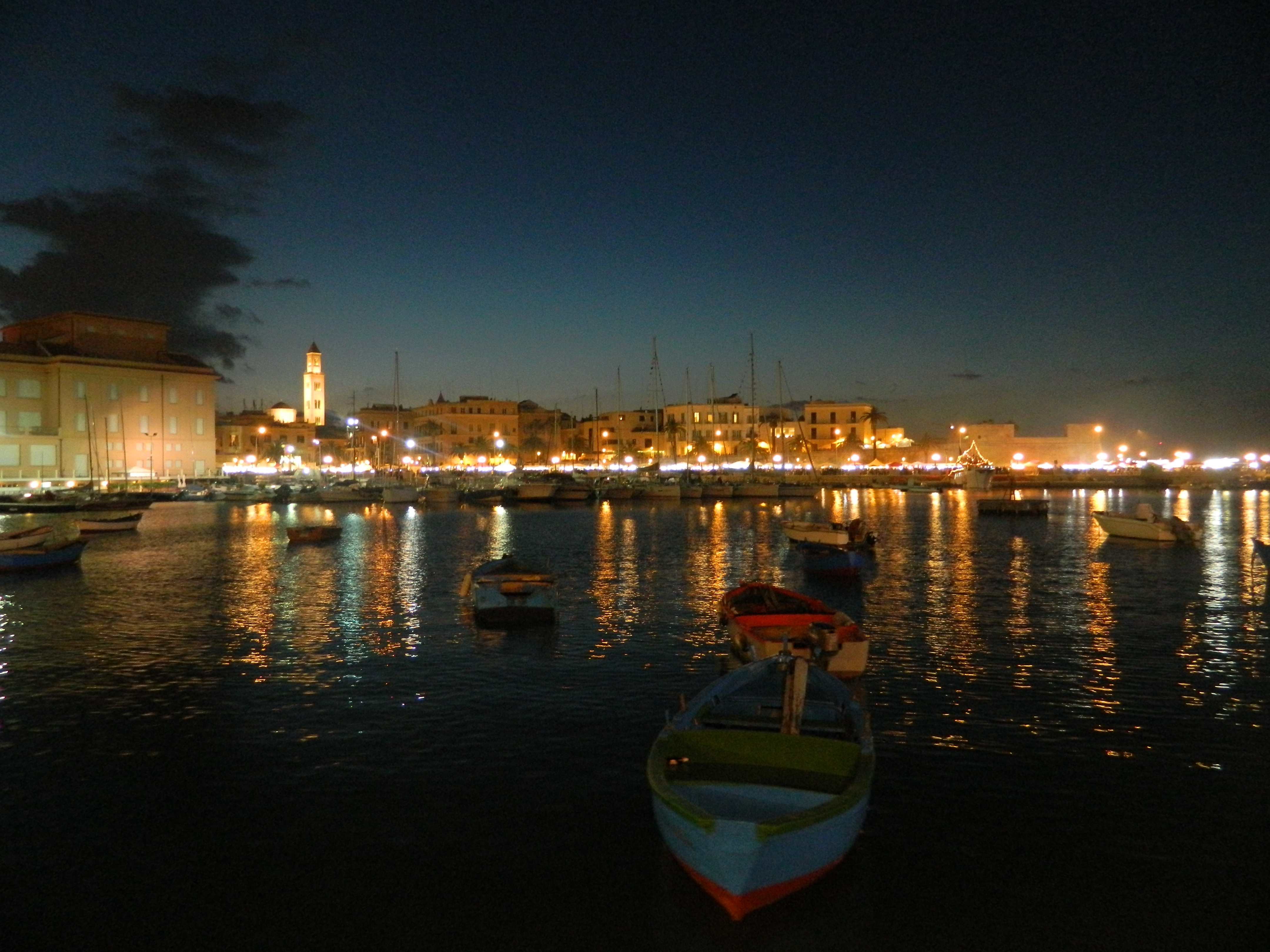 19:40 Uhr. Mittwoch, 7. Mai 2014. Der Hafen von Bari. Kleine Fischerboote in allen Farben genießen ihren Feierabend. Segelschiffe warten auf den Sommer. Gegen Abend wird es windig und kühlt etwas ab, aber der ansonsten sonnige, fast heiße Tag hängt noch in der Luft. Das Licht der untergehenden Sonne spiegelt sich für ein paar Minuten auf der gegenüberliegenden Mole.