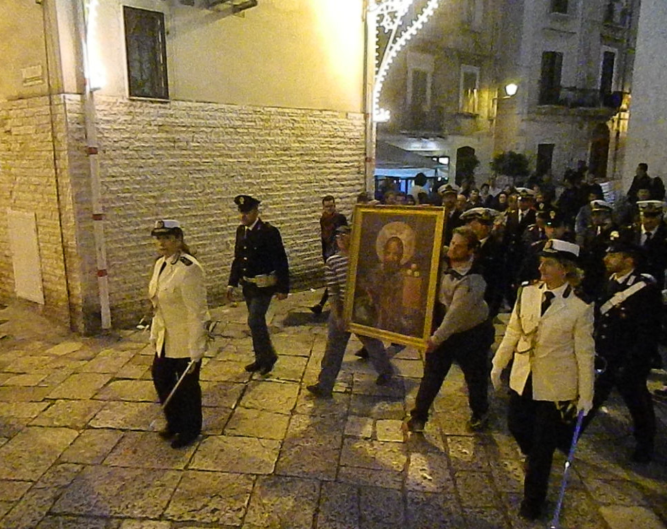 Abends wieder ein feierlicher Umzug. Der mehrstündige Trommelwirbel vom Vortag scheint auch die letzten Bareser auf das mehrtägige Fest aufmerksam gemacht zu haben. Das Gedränge ist doppelt so dicht wie am Tag zuvor. Heute wird anstatt der Nikolaus-Ikone eine lebensgroße Statue des Heiligen mit goldenem Umhang und Heiligenschein vom Hafen aus aus durch die Stadt getragen. Die Gläubigen bekreuzigen sich, wenn die Statue an ihnen vorbeigetragen wird.