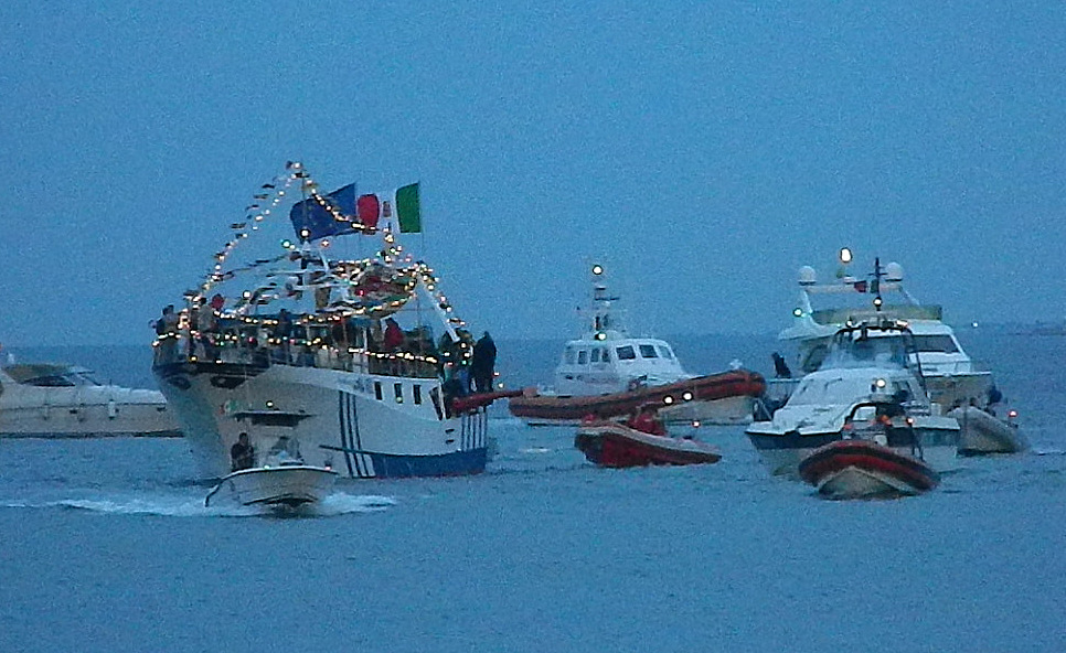 In die Dämmerung hinein schieben sich in der Ferne blinkende Blaulichter. Vom Meer her kommen fünf Polizeiboote und ein Boot der Marine mit einer Geschwindigkeit, die mit den Lichtsignalen und Sirenen nicht in Einklang steht. Nur langsam kommt der Schwarm an Schiffen näher, fast vorsichtig, so wie wenn er eine wertvolle Fracht beschützt. Und tatsächlich: Im Zentrum dieser Armada ragt das größte Boot heraus. Es ist mit Aufbauten versehen, die wiederum mit Girlanden, Blumen und Fahnen geschmückt sind. Die bunten Bänder wehen im Wind, genauso wie die italienische und die EU-Flagge. Manchmal heult eine Sirene auf.