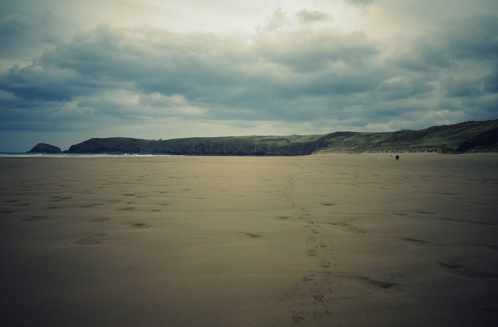 Die Marineinfanteristen kommen mir in den Sinn, weil der Strand von Perranporth genauso tückisch ist wie die Strände in der Normandie. Überall ziehen sich kleine Wasserläufe durch den Sand, die einen plötzlich umspülen und vom Land abschneiden. Man muss dann ganz schnell zurücklaufen und einen anderen Weg einschlagen. Oder wagemutig über einen gerade erst aufgetretenen Kanal springen. Oder man wird nass.