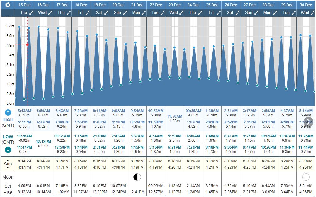 Aber hinter dem letzten Hügel wird es kompliziert. Die Flut kommt nämlich nicht wie die Nacht einmal, sondern zweimal pro 24 Stunden. Und nicht jeden Tag zur gleichen Uhrzeit. Und natürlich an jedem Küstenabschnitt wann anders. In den Buchhandlungen gibt es ein Büchlein zu erwerben, das für alle Strände, Häfen und Leuchttürme die genauen Ebbe- und Flutzeiten vorhersagt, aber die Tabellen sehen so aus, wie wenn man sie ohne Studium an der Marineakademie nicht verstehen kann.