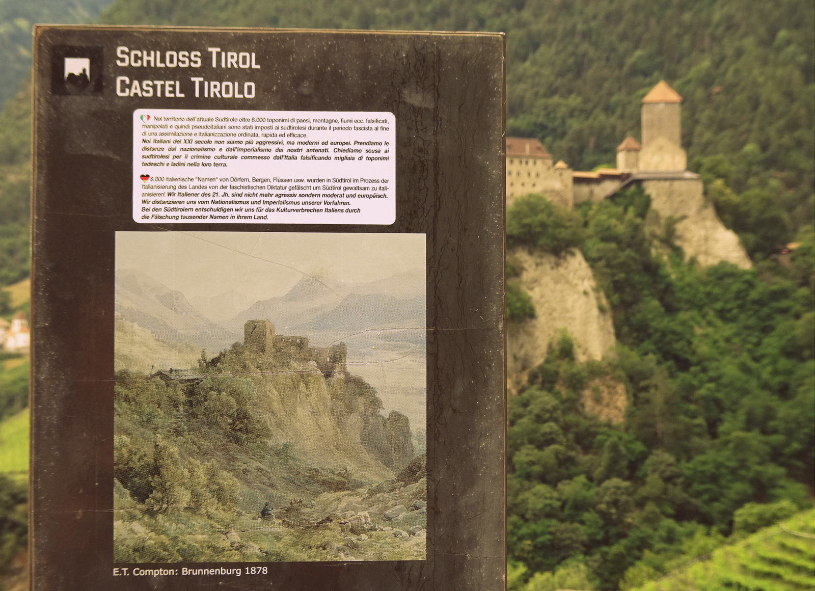 8000 ‚Namen‘ von Dörfern, Bergen, Flüssen u.s.w. wurden im Südtirol im Prozess der Italianisierung des Landes von der faschistischen Diktatur gefälscht, um Südtirol gewaltsam zu italianisieren. Wir Italiener des 21. Jahrhunderts sind nicht mehr aggressiv, sondern moderat und europäisch. Wir distanzieren uns vom Nationalismus und Imperialismus unserer Vorfahren. Bei den Südtirolern entschuldigen wir uns für das Kulturverbrechen Italiens durch die Fälschung tausender Namen in ihrem Land.
