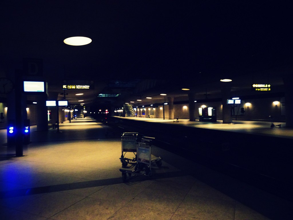 Die Fahrt ist kurz, dunkel und ereignislos. Der unterirdische Bahnhof ist lang, dunkel und ereignislos. Dennoch plane ich hier eine mehrstündige Pause, um im Sonnenaufgang über den Öresund zu fahren. Sonnenaufgangsfotos kommen nämlich immer gut an, v.a. bei der verschlafenen Leserschaft, die selbigen meist verpasst, verschläft und verschlumst. Außerdem wird es am Lufthafen hoffentlich Toiletten und endlich eine Schlafgelegenheit geben, hoffe ich. Ersteres zurecht, letzteres nicht. Die Sitze sind zu unbequem zum Einschlafen. Die wartenden Passagiere und die auf Passagiere wartenden Nichtpassagiere vertreiben sich die Zeit mit lautstarkem babylonischen Telefonieren. Ein Lufthafenmitarbeiter rast mit einer Putzmaschine auf und ab. Diese blöde Maschine, deren Sinn natürlich im Wegrationalisieren von Arbeitskräften besteht, macht so viel Lärm, dass ich verstehe, warum Menschen nicht neben dem Lufthafen wohnen wollen.