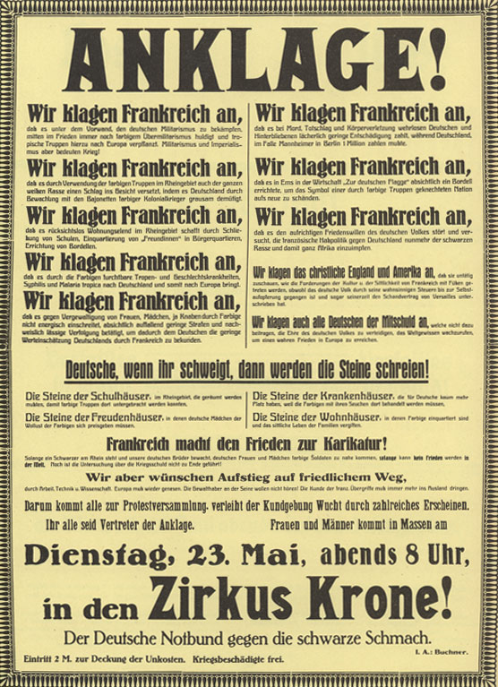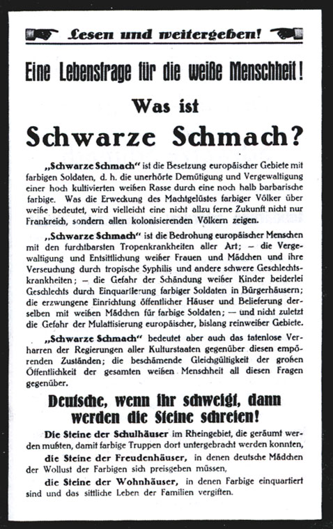 Die Steine werden schreien! Alle Deutschen sind Vertreter der Anklage! Grausame Demütigung Deutschlands durch farbige Kolonialkrieger! Ein Schlag ins Gesicht der ganzen weißen Rasse! Vergewaltigung von Frauen, Mädchen, ja Knaben! Farbiger Übermilitarismus! Schwarze Schmach! Ganz starker Tobak! Viele Ausrufezeichen!