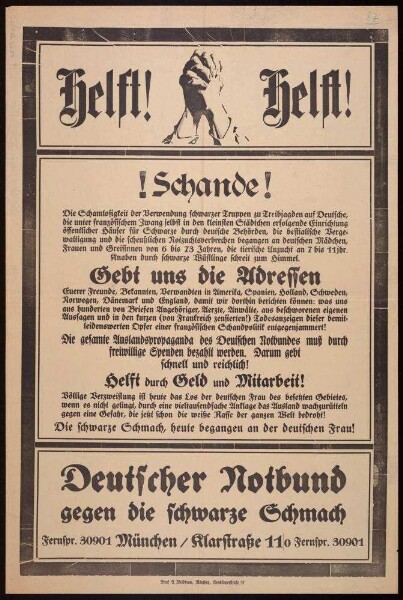 Der Notbund gab eine Zeitung heraus, „Die Schmach am Rhein“. Im ganzen Land wurden Flugblätter verteilt, um die Menschen aufzuwiegeln. Die Kinos zeigten Hetzfilme. Es gab Hetzgedichte, -romane, -karikaturen. Und alles immer ganz dramatisch, vollkommen realitätsfern überzeichnet: Ein Notschrei an die Menschheit! Treibjagden auf Deutsche! (Erinnert sich noch jemand an die Diskussion um die Hetzjagd in Chemnitz?) Die weiße Rasse der ganzen Welt ist bedroht! Eine Lebensfrage für die weiße Menschheit! Vergewaltigung einer hoch kultivierten weißen Rasse durch eine noch halb barbarische!