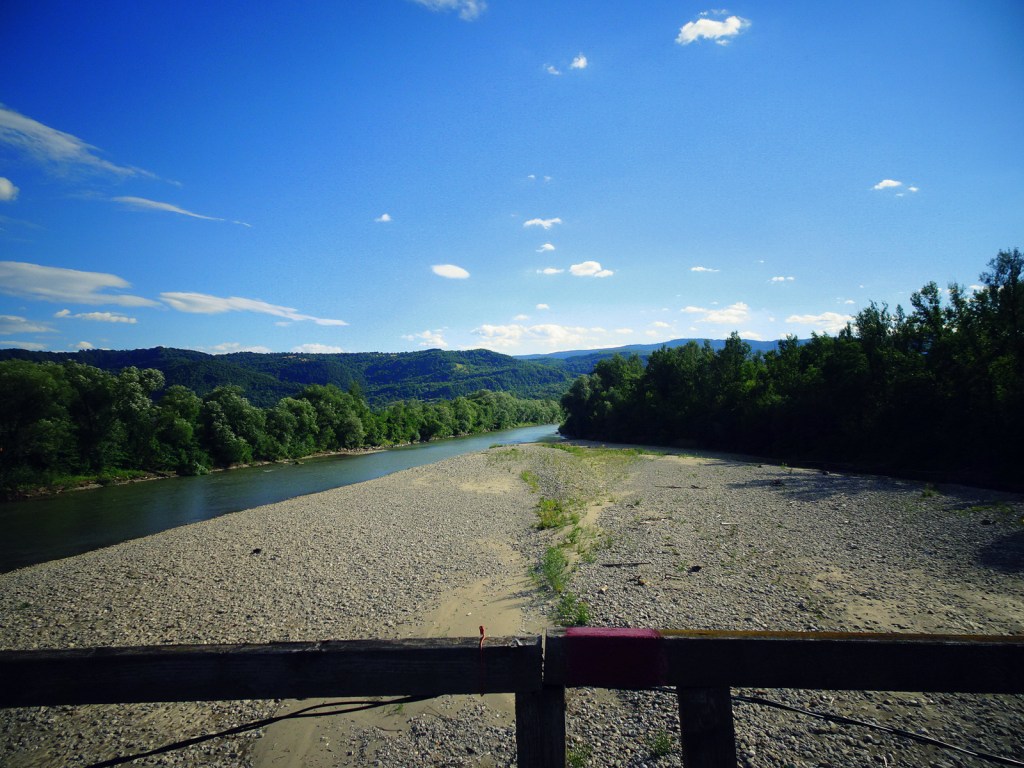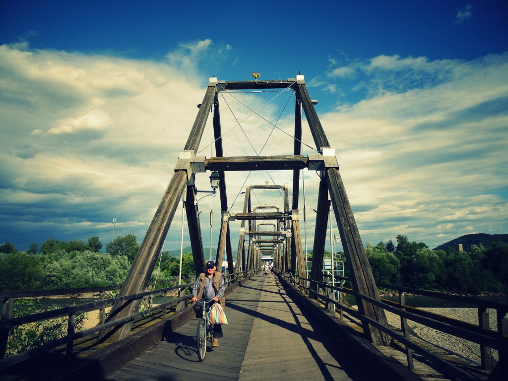 Aber wenn meine Informationen stimmen, so liegt der Mittelpunkt Europas direkt am Fluss Theiß. Beziehungsweise an der Tisa, wie sie in den örtlichen Sprachen heißt. Und zwar dort, wo er schon nach Norden abgebogen ist und nicht mehr die Grenze markiert. Die Eisenbahnbrücke verbindet hier zwei ukrainische Ufer und wird von ukrainischen Soldaten patrouilliert.