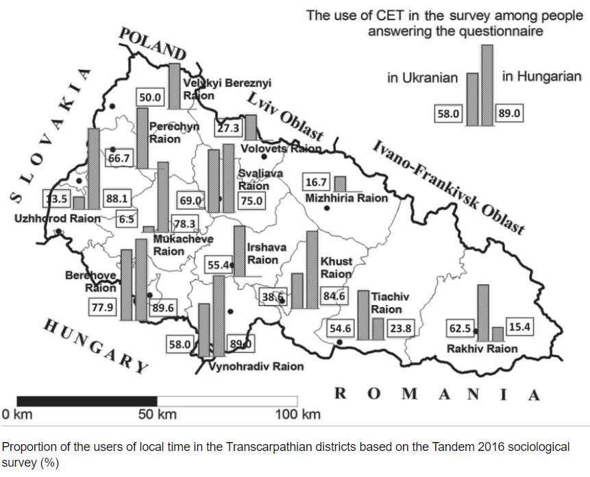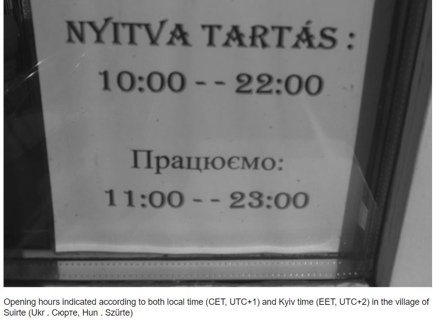 Und falls Ihr Euch jetzt fragt, ob ich das erfunden habe – eine angesichts meiner Recherchearbeit fast schon unanständige Frage: Nein! Es gibt sogar wissenschaftliche Untersuchungen über die Transkarpatenzeit. Die Grafik zeigt den Anteil der Bevölkerung, die 2016 noch die Habsburgerzeit verwenden, das Foto zeigt die Öffnungszeiten einer Pizzeria in der Ukraine nach Wiener und Kiewer Zeit.