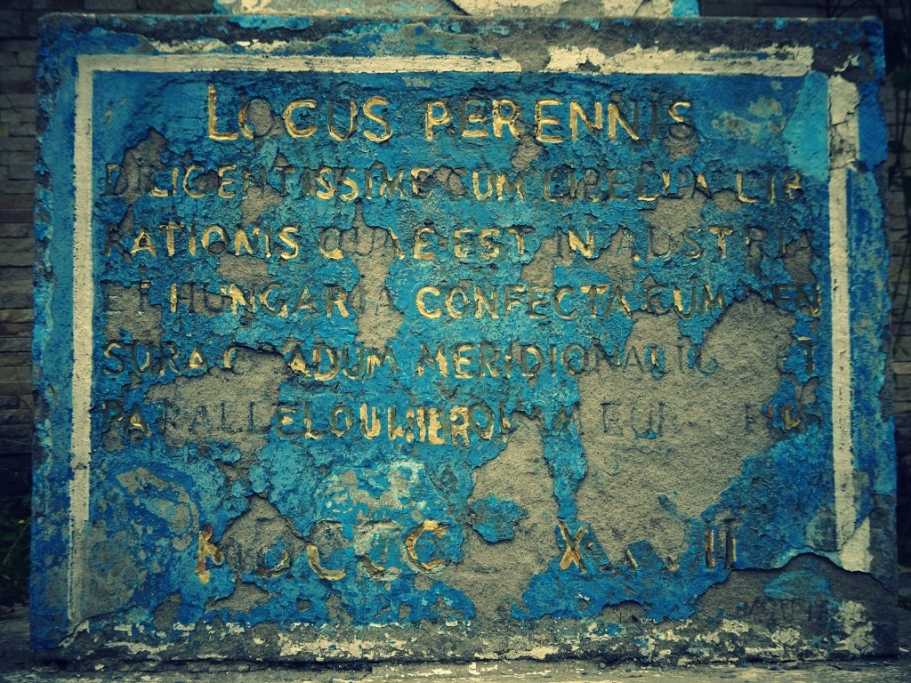 Dies ist ein dauerhafter und für die Ewigkeit festgehaltener Ort, der durch eine spezielle in Österreich-Ungarn hergestellte Wasserwaage unter Verwendung des Systems der Breiten- und Längengrade mit europäischer Präzision bestimmt wurde. 1887.