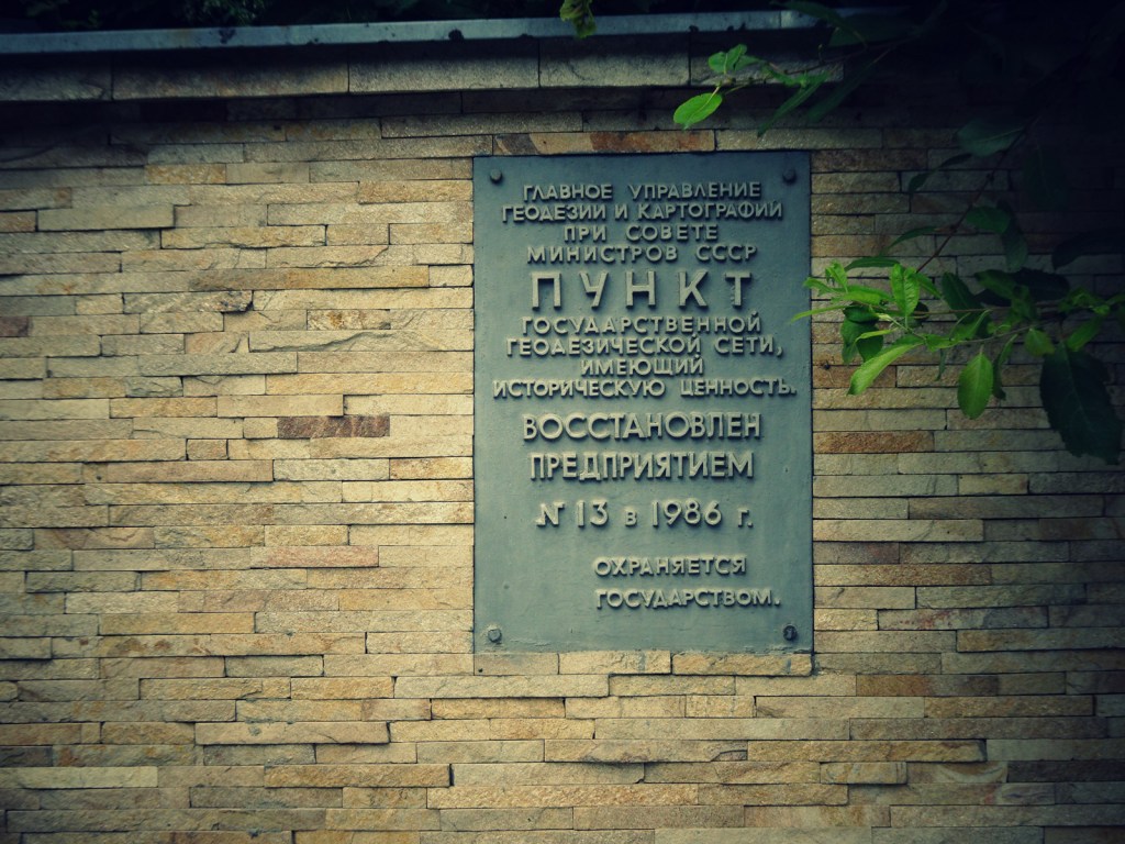 Diese sowjetische Plakette befindet sich noch immer neben der Stele. Sie besagt in etwa: „Hier ist nach dem Dafürhalten der Geografischen Kommission der Ukrainischen Sozialistischen Sowjetrepublik und des zuständigen Ministers im hochehrwürdigen Rat der Union der Sozialistischen Sowjetrepubliken ein bedeutender Punkt, der so einmalig und einzigartig ist, dass es in nur an diesem einen Punkt geben kann.“