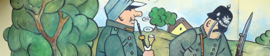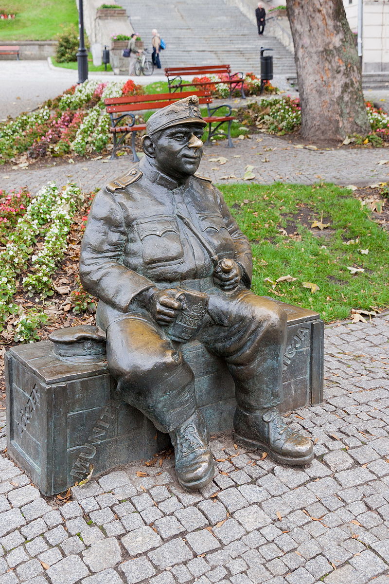 Wenn die Soldaten eine Verschnaufpause bekommen, dann sitzen sie vielleicht auf einer Bank neben einem Kameraden aus Bronze oder Messing oder was immer die Schmelzerei noch übrig hatte. Denn auch in der Ukraine, z.B. in Lemberg, in Skelivka, in Luzk, in Uschhorod, in Kiew und in Odessa gibt es Denkmäler für den Soldaten Josef Schwejk, der selten mit Karabiner oder Kanone, aber dafür umso häufiger mit Pfeife oder Bierkrug abgebildet wird.
