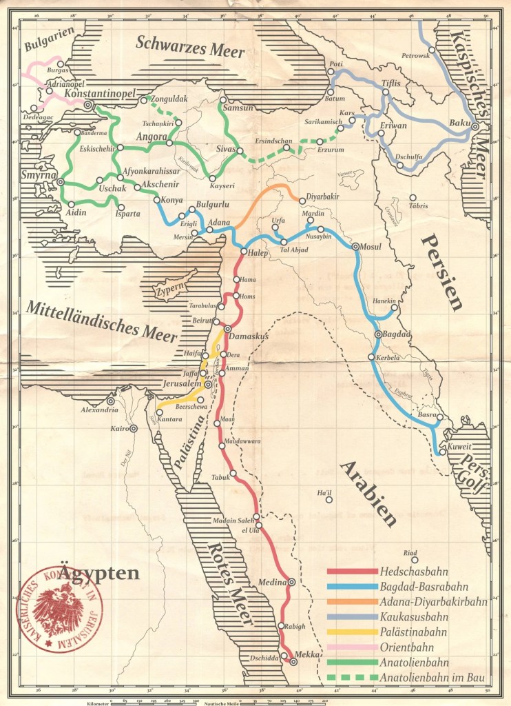 Wer nicht baden, sondern beten wollte, der bestieg in Aleppo den Zug nach Süden und fuhr nach Damaskus, nach Haifa, nach Jerusalem, nach Medina. Das letzte Teilstück nach Mekka, eigentlich der Anlass für die gesamte Strecke, wurde nicht mehr verwirklicht, weil – naja, dazu kommen wir später. Aber dass die Briten daran schuld sind, das wisst Ihr ja schon.