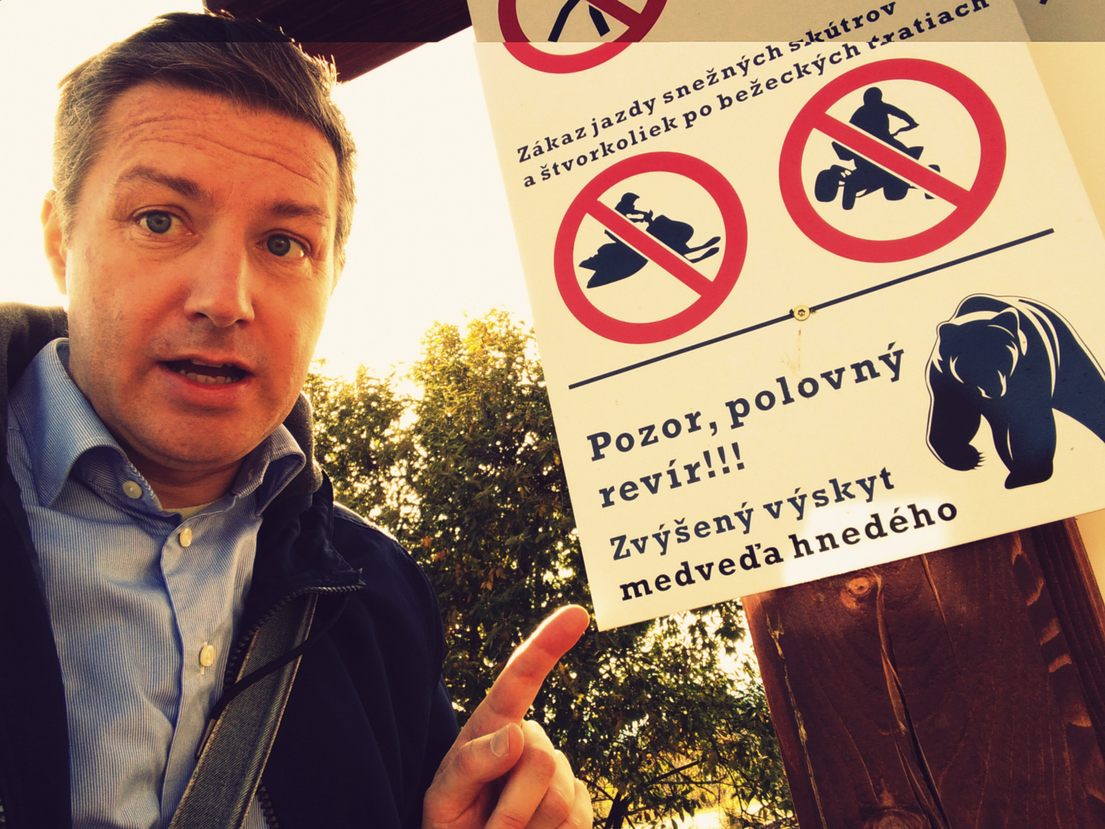 Vor kurzem, als ich in der Nähe von Kremnica beim Wandern war, habe ich mich ein bisschen über dieses vor Braunbären warnende Schild lustig gemacht. Quickfidel und lebensfroh ging ich in den hinter dem Schild liegenden Wald, qualmte eine Bärenanlockungszigarre und legte nur deshalb kein die Kuscheltierchen anziehendes Futter aus, weil ich sogar meine eigene Wegzehrung vergessen hatte.
