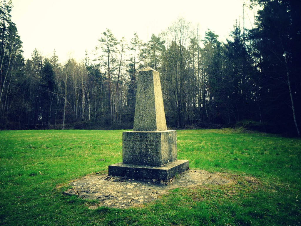 Drei Rehe äsen auf der Wiese, das saftige Gras sowie die ersten zarten Sonnenstrahlen genießend. Aber sobald sie mich hören, springen sie ins Gebüsch. (Auf dem ersten Foto könnt Ihr rechts von der Stele noch die drei weißen Popos erkennen.) Sie scheinen keine Besucher gewohnt zu sein. Oder nur Besucher, die sie abknallen wollen.