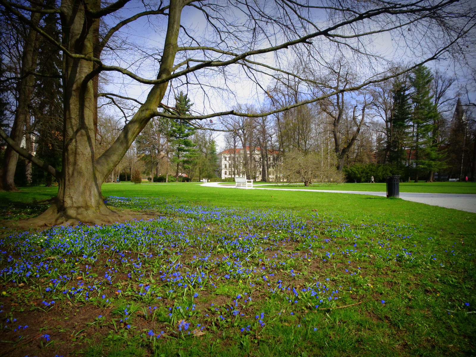 Ein paar Minuten später sitze ich schon im Park und merke, dass mich die blauen Blümchen mehr faszinieren als der feine Staub hoch oben im Geäst. Ich bin halt einfach ein Romantiker.