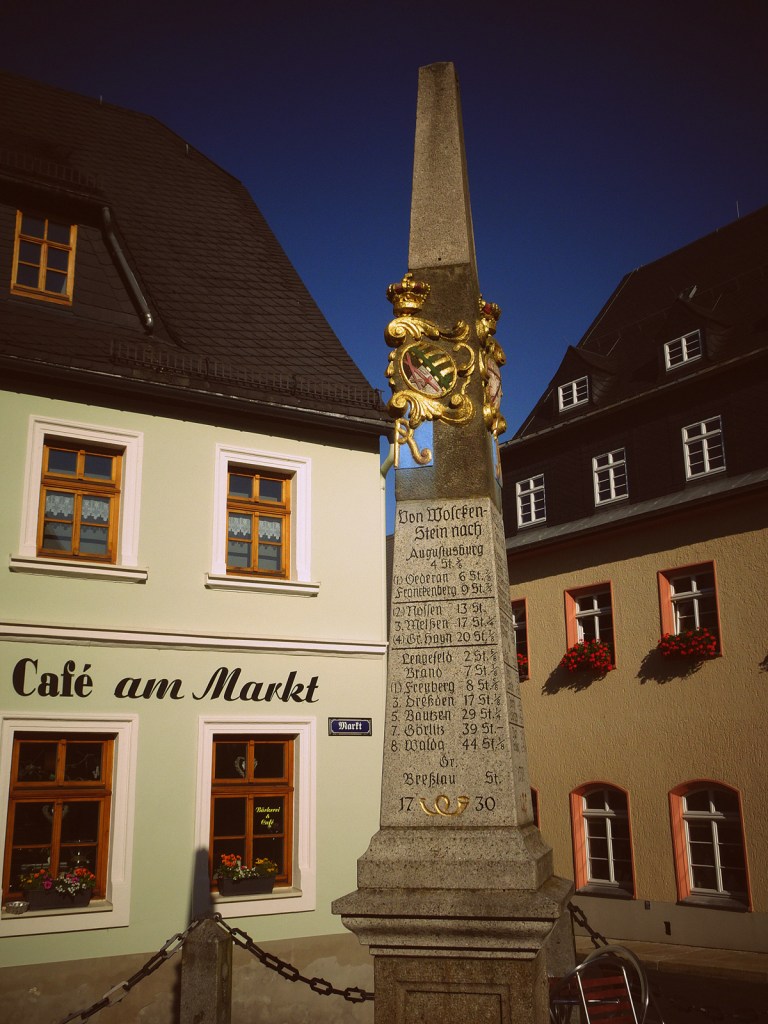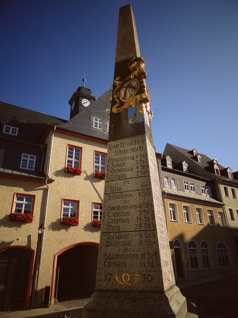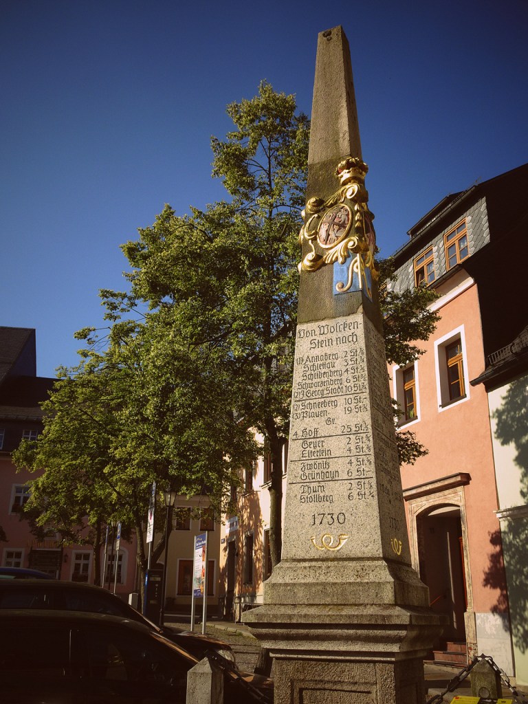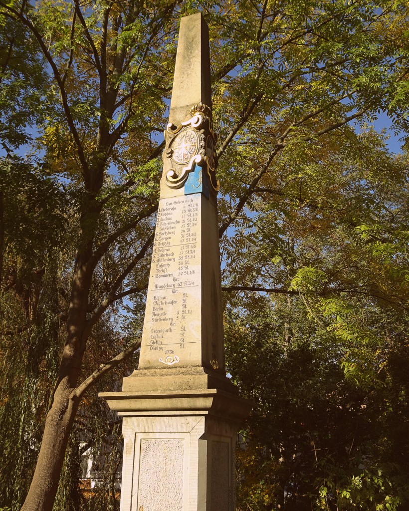 Die haben da sogar eine Postmeilensäule. In Sachsen wurden im 18. Jahrhundert überall diese Säulen aufgestellt, die Reisezeiten in alle umliegenden und ein paar entfernter liegende Städte mit beunruhigendem Genauigkeitsanspruch anzeigten.