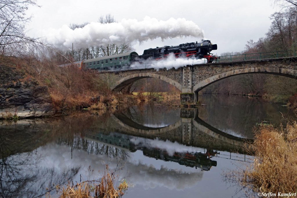 Außerdem ist die Fahrt durch das Zschopautal schon ein Erlebnis an sich. Es ist ein enges Tal, der Zug fährt ganz nah am Fluss und überquert ihn von Zeit zu Zeit auf schön geschwungenen Steinbrücken oder waghalsigen Stahlkonstruktionen, wie quergelegte Eiffeltürme.