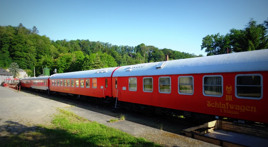 Zuerst mal ein paar positive Worte über den hiesigen Bahnhof, nachdem ich mich in letzter Zeit despektierlich über Provinzbahnhöfe in Sachsen geäußert habe, z.B. in Geithain oder Pratau. Der Bahnhof in Wolkenstein ist bestückt wie die Orient-Express-Endhaltestelle in Paris: Schlafwagen, Speisewagen, Buffetwagen, Lazarettwagen, alles erster und zweiter Klasse, und sogar der Regierungszug des DDR-Staatsrats mit Suite Walther und Suite Erna.