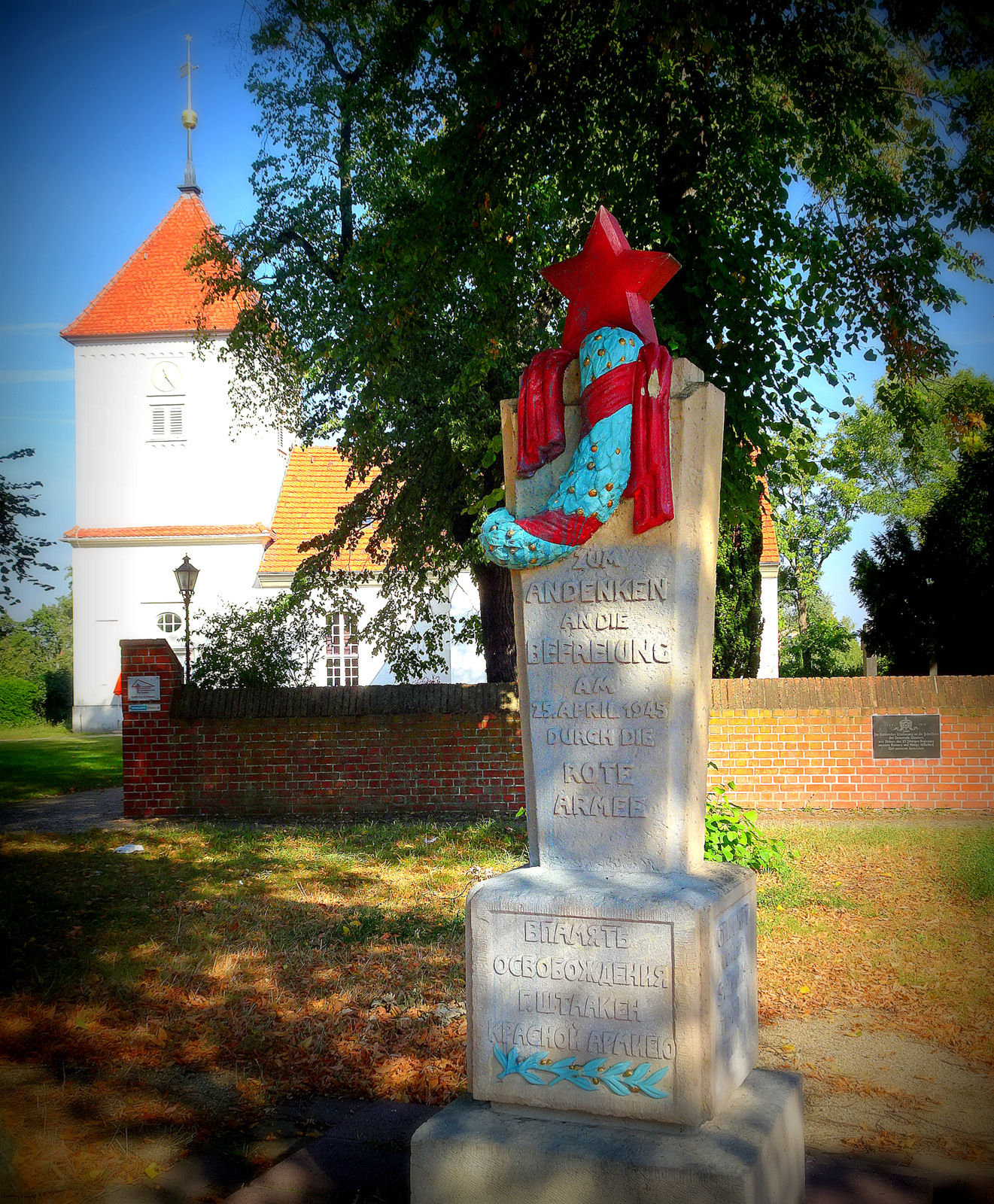 Ich weiß gar nicht, wo ich anfangen soll, also beginnen wir einfach mit dem hübschen Obelisk vor der Kirche. Die befreite Bevölkerung, die zwölf Jahre lang keinen eigenen Finger für die Befreiung von den Nazis rührte, bedankt sich bei der Roten Armee.
