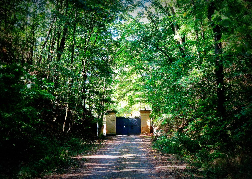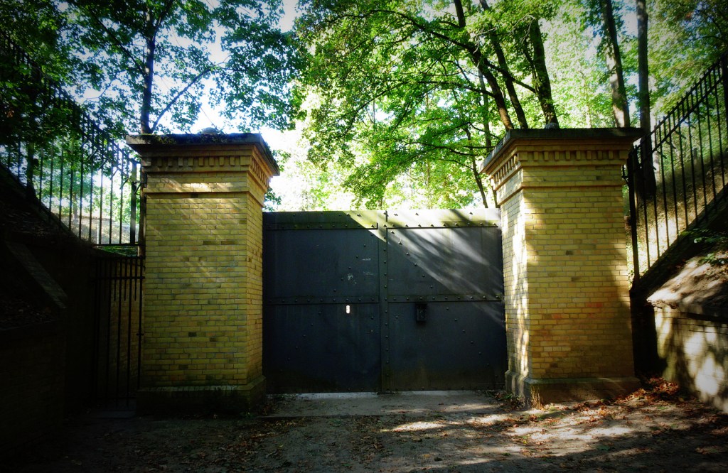 Ich folge einem kleinen Pfad und finde mich vor einer verschlossenen Pforte, die durch ihre Massivität suggeriert, dass dahinter etwas besonders Geheimhaltungsbedürftiges verborgen sein muss. Ich rüttle am Tor, wie man das in Berlin so macht, wenn man unbedingt wo rein will.