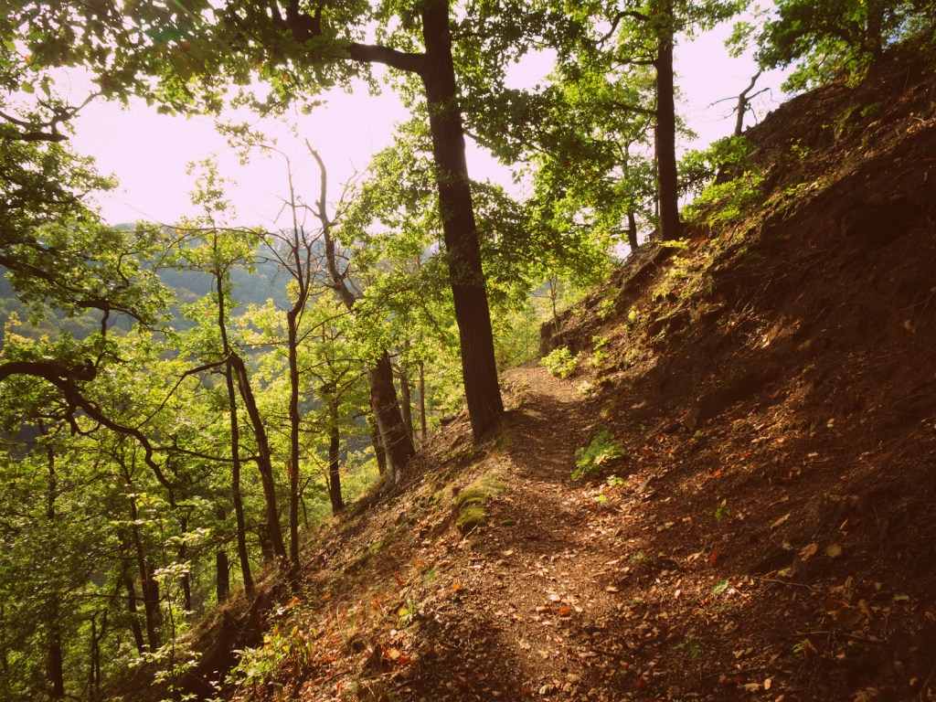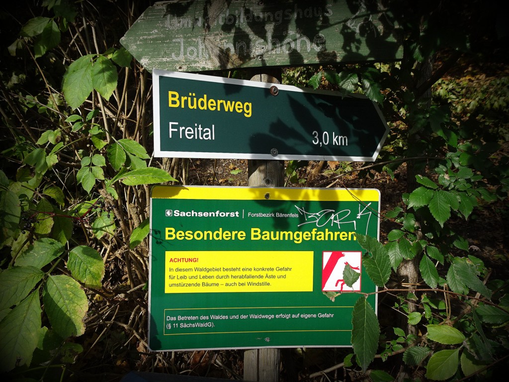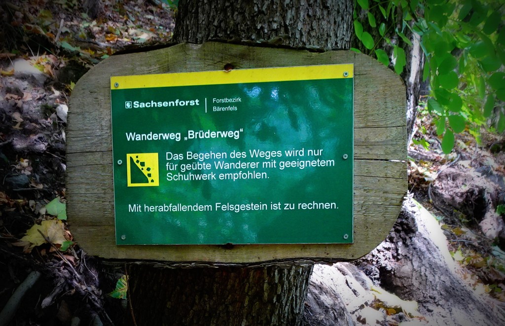 Die steilen Hänge auf der Nordseite hingegen werden von der Sonne beschienen und locken den mutigen Wanderer. Gefahrenhinweise auf Steinschlag, herabfallende Äste, umfallende Bäume, freilaufende Bären und § 11 Absatz 2 Satz 1 des Sächsischen Waldgesetzes können mich nicht abhalten. (Obwohl das mit den Astbrüchen tatsächlich ein zunehmendes Problem ist. Wegen der Trockenheit merken die Bäume, dass sie nicht ausreichend Wasser bekommen und lassen einzelne Äste absterben. So kann selbst von einem gesund aussehenden Baum unvermittelt ein Ast herabfallen.)