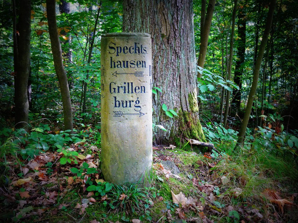 Zweitens, ich bin schon drei Stunden unterwegs und stecke noch immer im gleichen Wald, obwohl ich schnurstracks nach Osten und ganz sicher nicht im Kreis gelaufen bin. Das mit den 1,85 Meilen kann nicht stimmen. – Und da fällt mir ein, dass ich mich schon einmal über diese sächsischen Postmeilensäulen gewundert habe. Damals hat ein kenntnisreicher Leser (überhaupt ist die Leserschaft das Schlaueste an diesem Blog) zu erklären versucht, dass sächsische Postmeilen keine Meilen sind, sondern irgendeine Formel aus Stunden mal Pferdestärke, geteilt durch die Quadratwurzel des Alkoholisierungsgrades des Postkutschers oder so. Ich habe es nicht kapiert, ehrlich gesagt. Im Ergebnis entspricht eine sächsische Postmeile jedenfalls etwa 9 km. Die 1,85 Meilen nach Tharandt bedeuten also fast 17 km. Na super, dann kann das noch dauern.