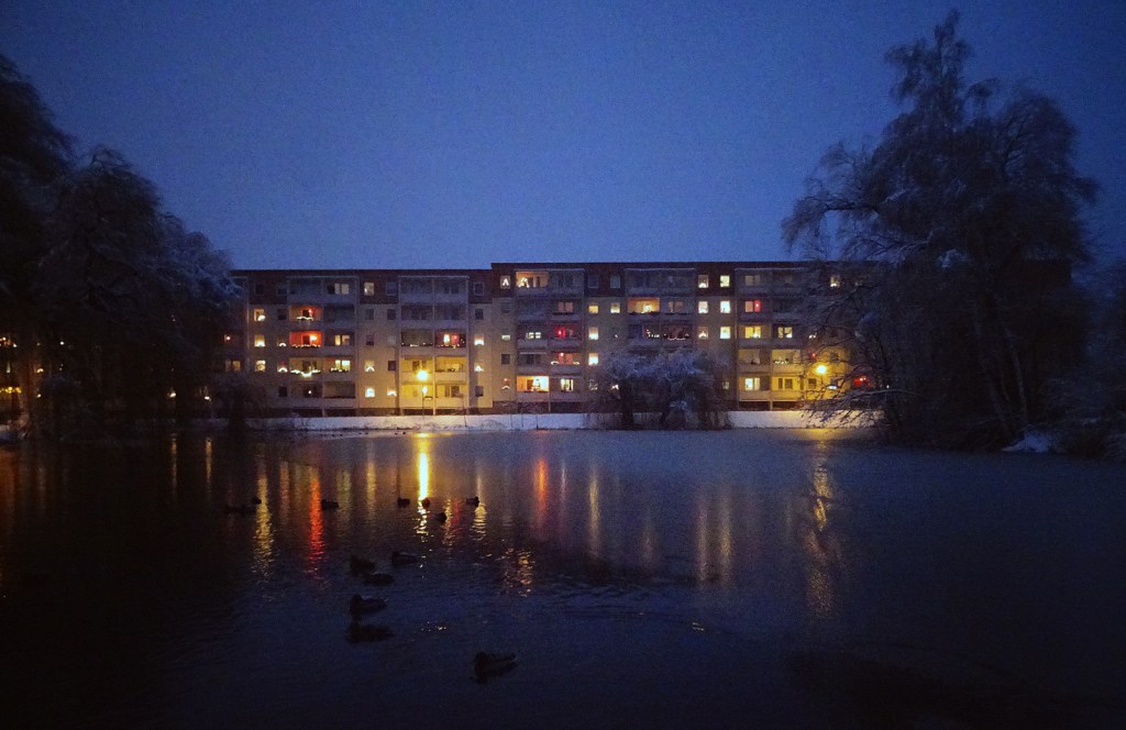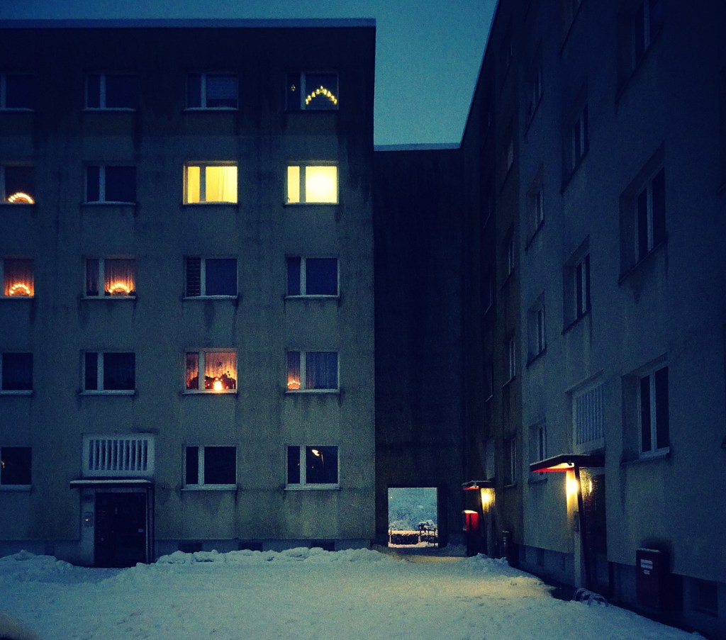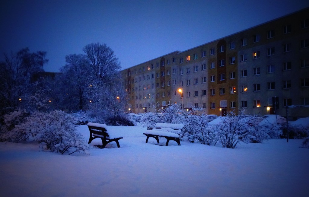 Noch nie habe ich einen Plattenbau so schön stimmungsvoll in Szene gesetzt gesehen wie hier. Da hat man fast schon Lust, sich bei Schnee und Kälte auf einen Spaziergang zwischen all den Blocks und all den Lichtern zu begeben. Fast… 😉 Schöne Weihnachten wünsche ich dir, auch wenn du eigentlich davor flüchten wolltest (?).