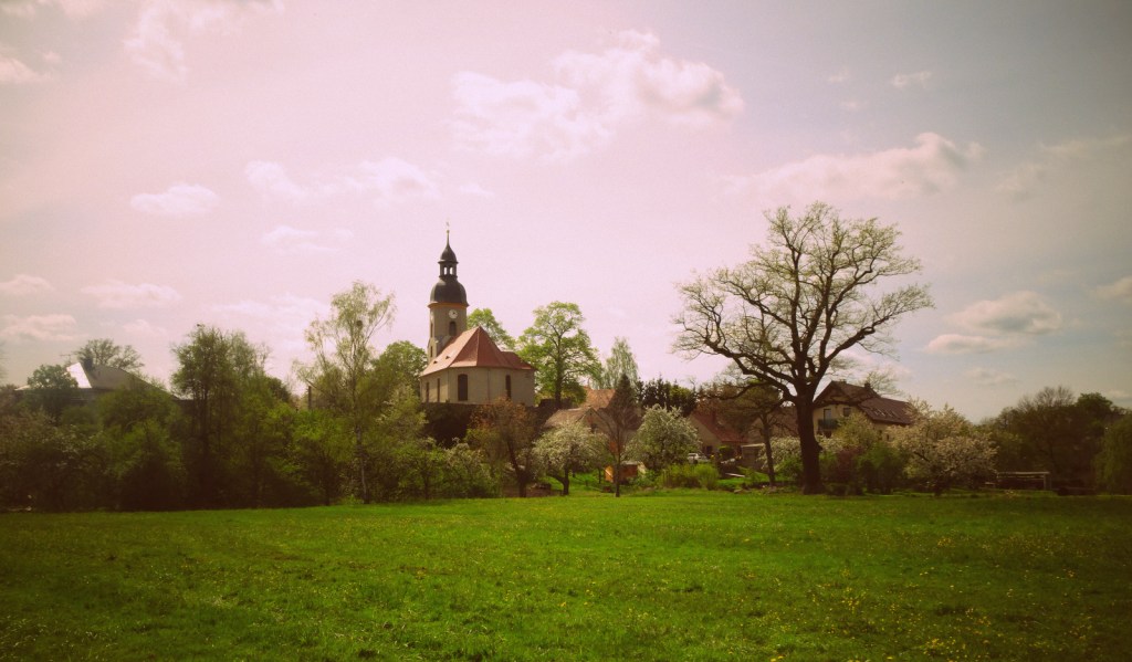 Auf einem Foto von 1936 sieht man den markanten Glockenturm aus Holz, den Ihr eingangs auf dem dritten Foto erkennt. (Auf der Seite des Heimatvereins Liegau-Augustusbad findet Ihr noch viel mehr historische Postkarten sowie Fotos vom aktuellen Zustand.)