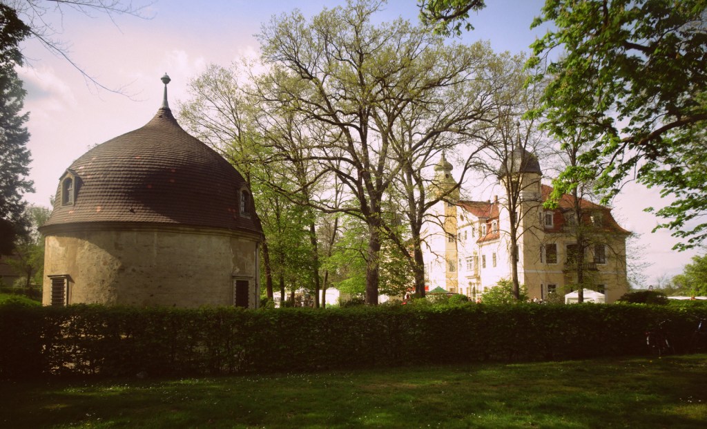 Eigentlich muss ich dringend nach Radeburg und Radebeul und wollte deshalb allen unterwegs lauernden Ablenkungen entsagen. Aber dieses eine Schloss gönnen wir uns, auch wenn es ein beschwerlicher Umweg ist. Irgendwann laufe ich mir noch die Füße platt, nur weil die weltweite Leserschaft unersättlich nach Schlössern gelüstet.