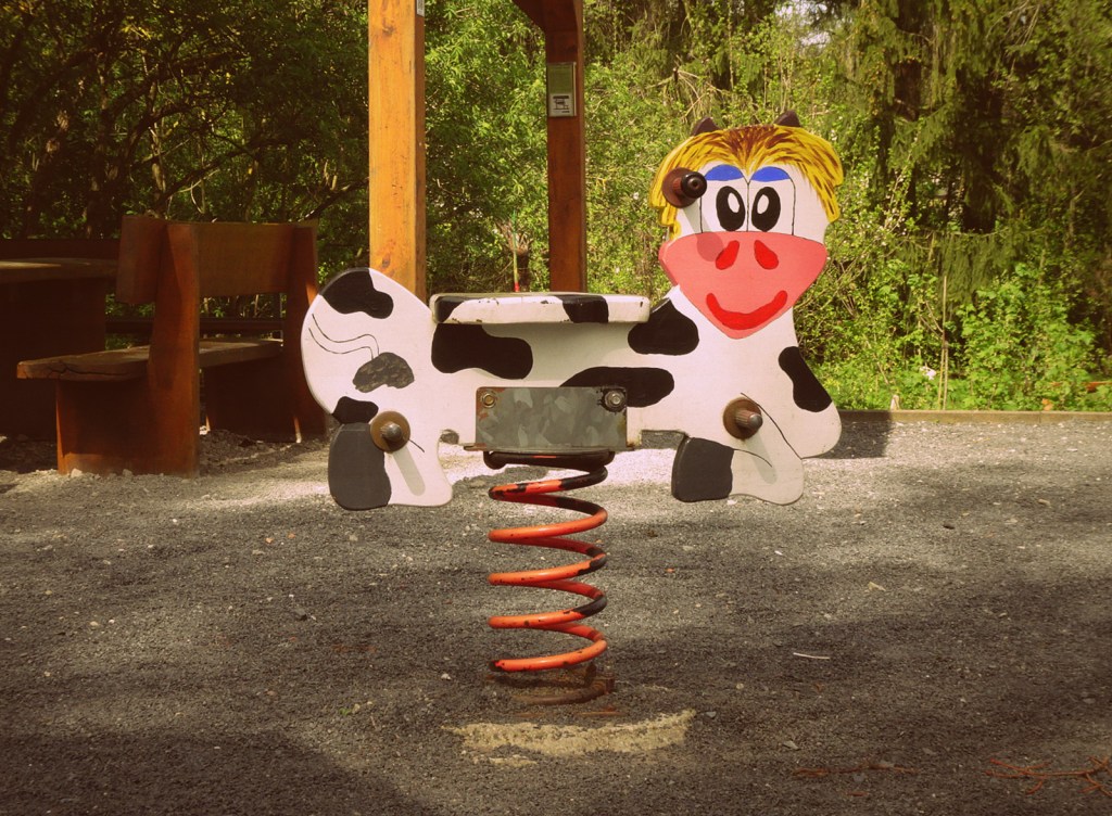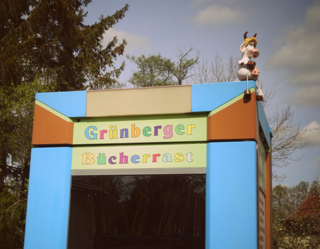 Das soll jetzt kein despektierliches Verdikt eines Großstädters (der selbst aus einem kleinen Kaff stammt) sein. Nein, es ist einfach nur eine Feststellung. Denn die Grünberger und Grünbergerinnen scheinen sich wirklich sehr mit Kühen zu identifizieren. Überall sitzen, stehen, liegen und lauern Kühe. In den Gärten, auf dem Spielplatz, am Wertstoffhof, auf dem Verteilerkasten und sogar auf dem öffentlichen Bücherschrank.