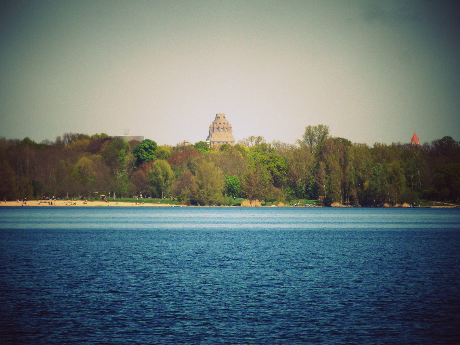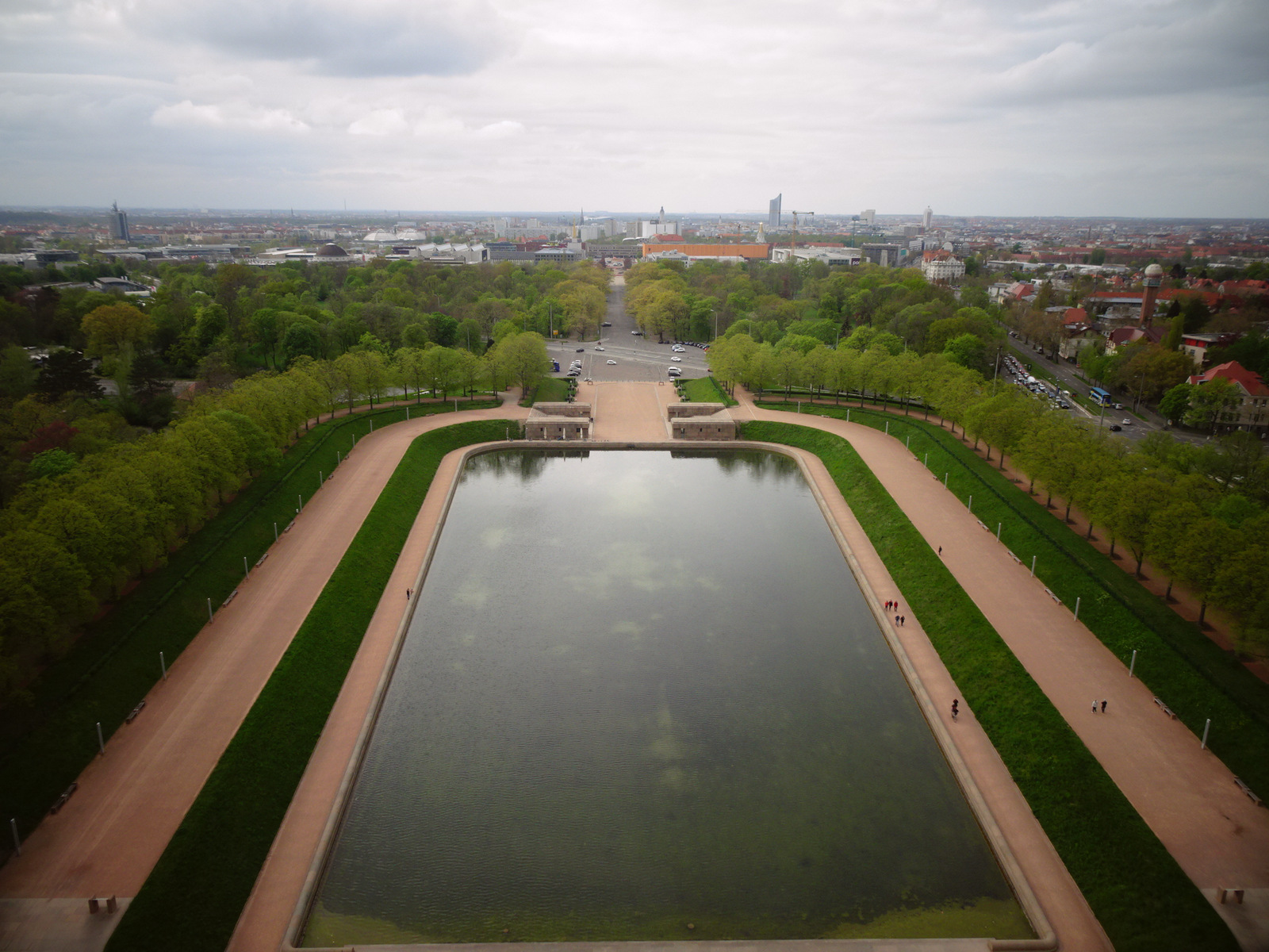 Ganz in der Ferne das Kraftwerk Lippendorf, das die letzte Braunkohle verfeuert. In der Halbferne gemütliche Mehrfamilienhäuser. Und direkt zu Füßen des Völkerschlachtdenkmals ein Schloss in einem Wald.