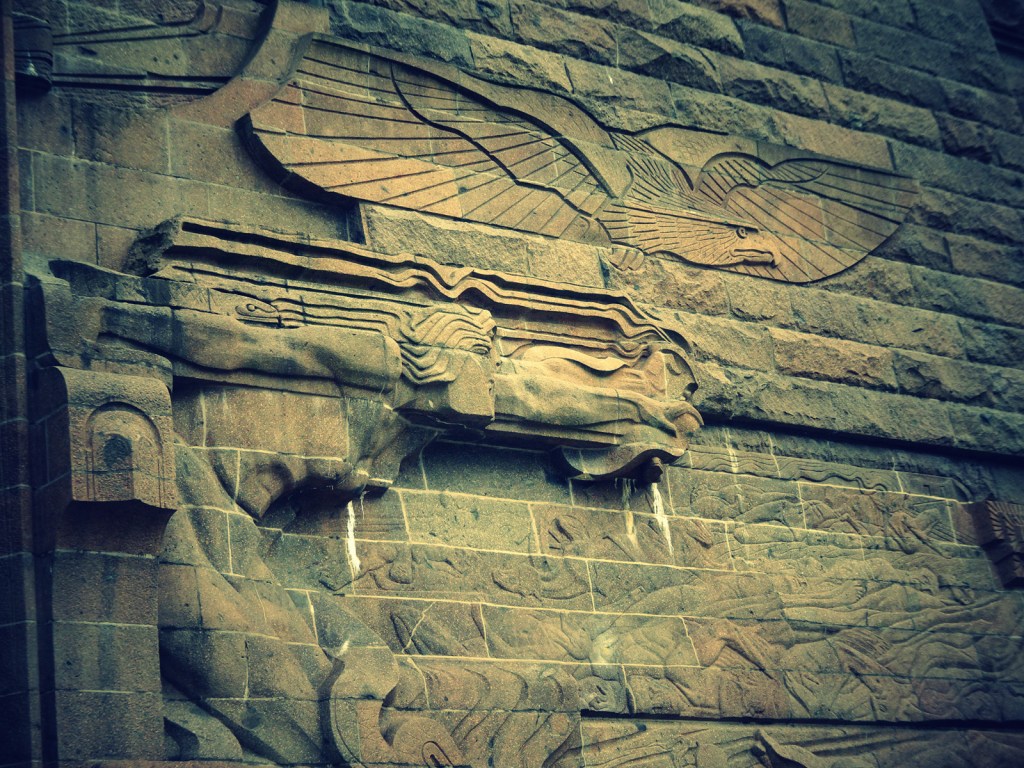 Überhaupt ist es ein interessanter Stilmix. Die Figuren sehr martialisch, kantig, muskulös. Viel mittelalterliche Symbolik mit Schwertern und Schildern und Ritterrüstungen. Aber die Reliefs in einer Mischung aus Jugendstil und sozialistischem Realismus avant la lettre.
